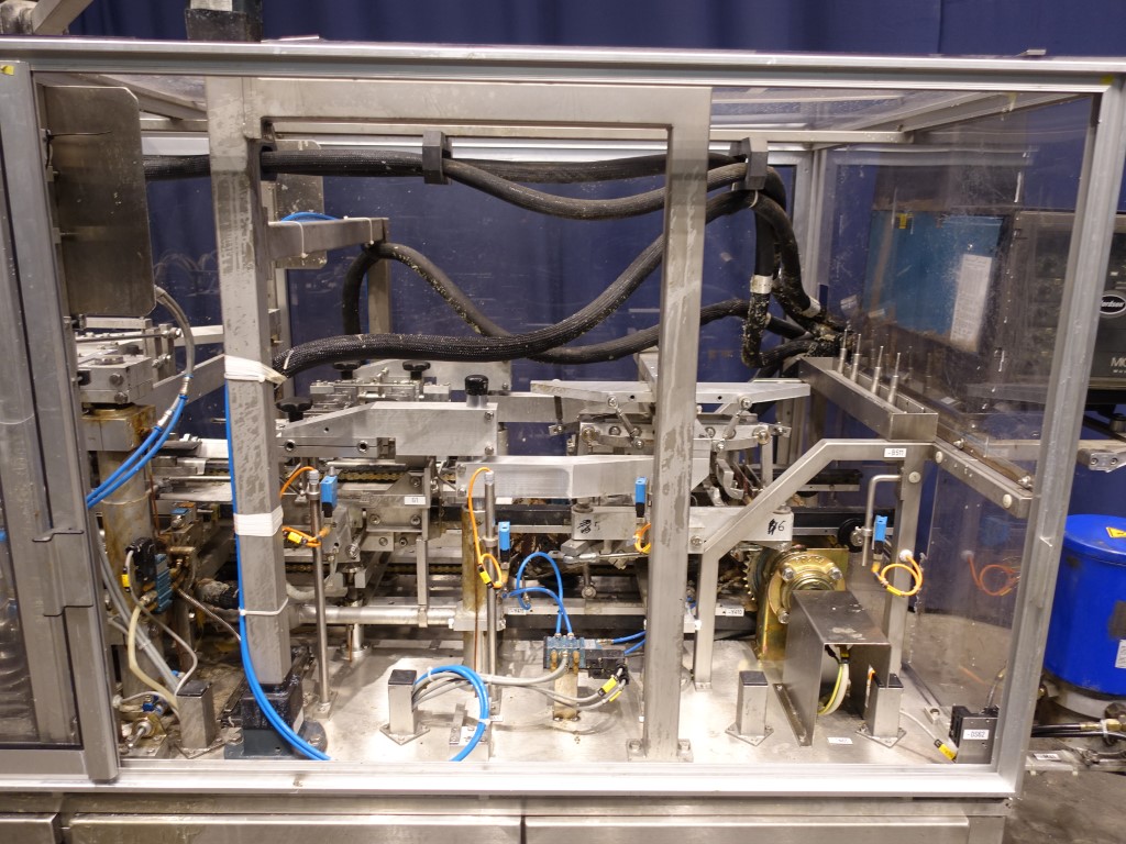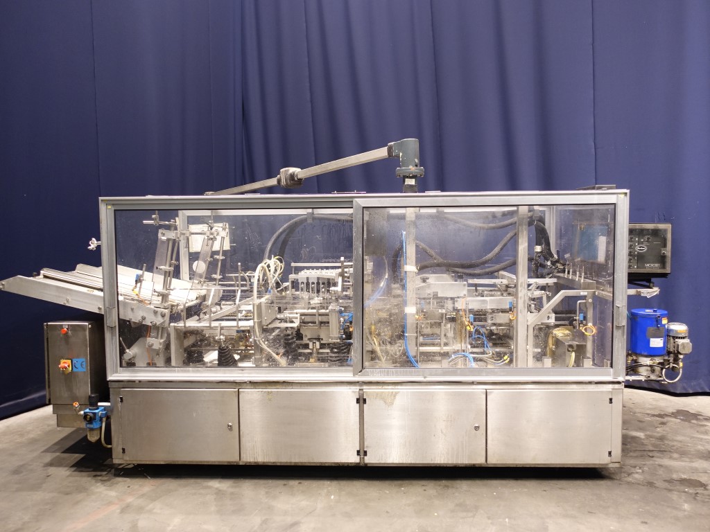Fully automatic trayformer to make trays with logs from plano, format 4x6 = 24 cups/tray. The trays are formed in 4 steps including a step to glue in the middel of carton for re-inforcement carton by press fingers. Modicon TSX Micro PLC. Including hotmelt glue device, manufacturer Nordson, type: 3500. Total dimensions: 410 x 130 x 190 cm.