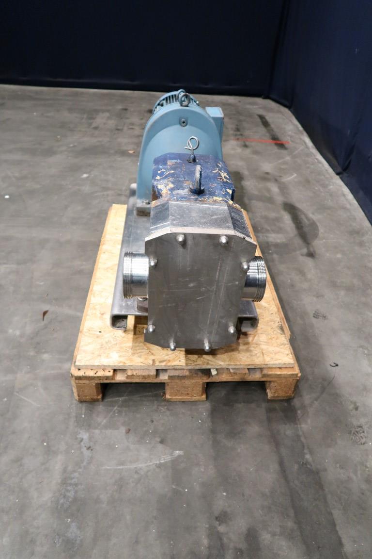 Lobe pump with tri stainless steel lobbes. Diameter lobbes: 180 mm. Displacement per revolution: ± 0,8 ltr. Current drive work: motor: 11 kW - 22 A - n1: 1440 rpm, n2: 315 rpm. Mounted on SS feet plate. Connections: DN100/DN100.