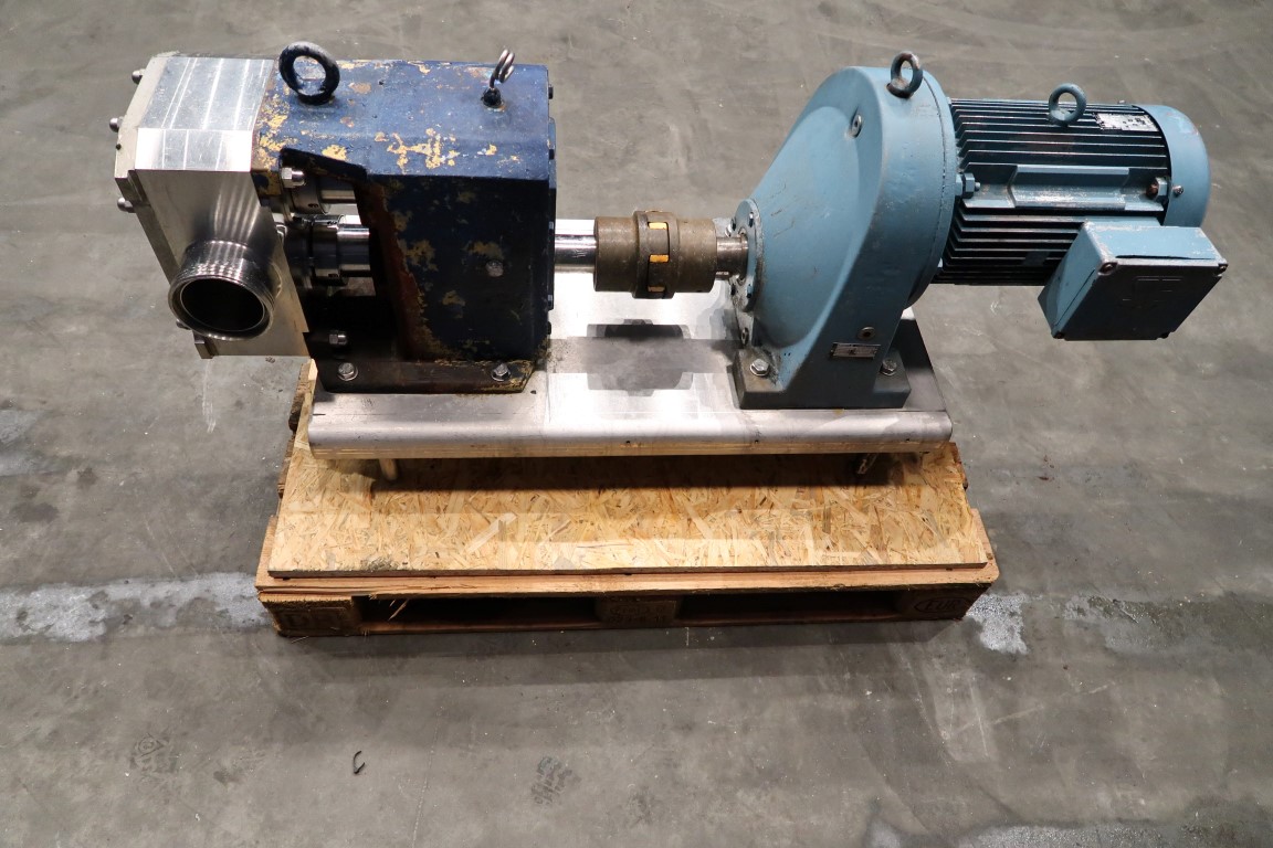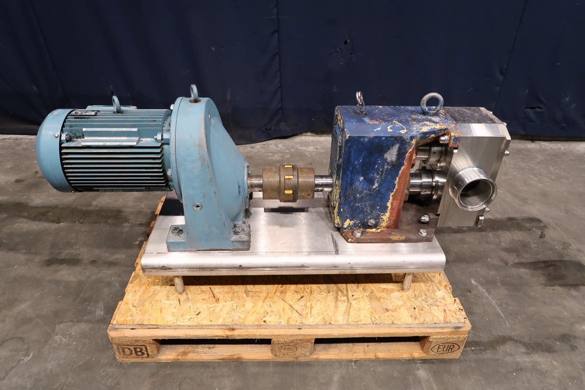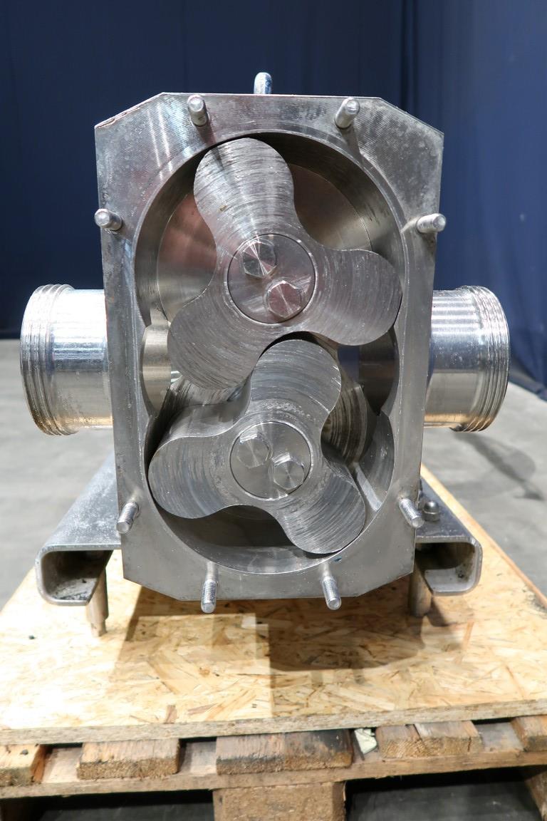 Lobe pump with tri stainless steel lobbes. Diameter lobbes: 180 mm. Displacement per revolution: ± 0,8 ltr. Current drive work: motor: 11 kW - 22 A - n1: 1440 rpm, n2: 315 rpm. Mounted on SS feet plate. Connections: DN100/DN100.