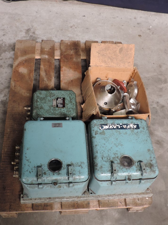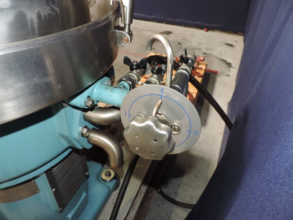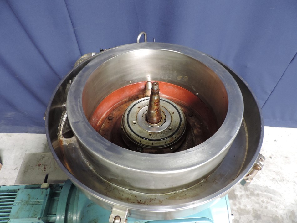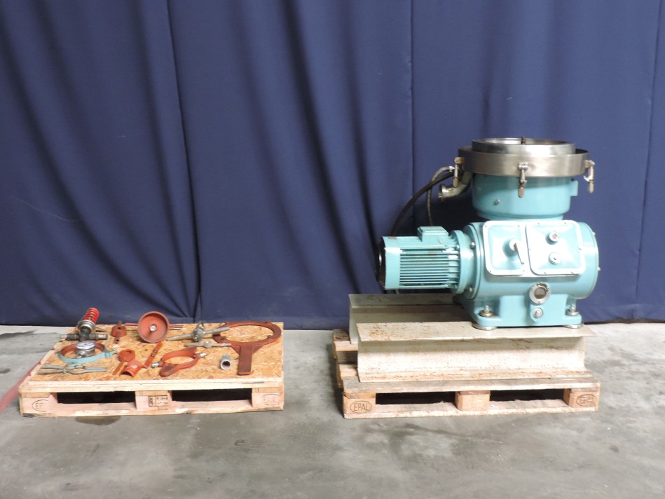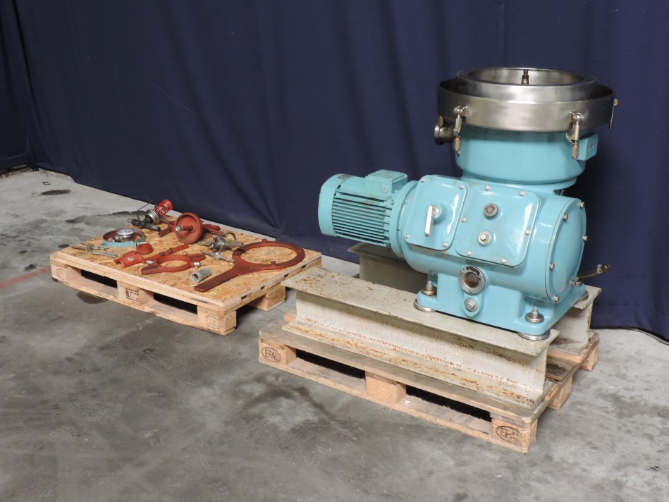 Incomplete self cleaning separator frame with tools (no bowl, no hood, no outfeed pump). Worm wheel - shaft speed 1420-1500 rpm. Counter speed 118-125 rpm. For separation of 2 liquid phases and fine solids. Can be used for vegetable oil degumming, oil/water separation and more.