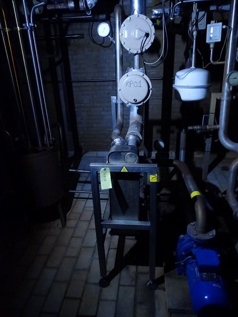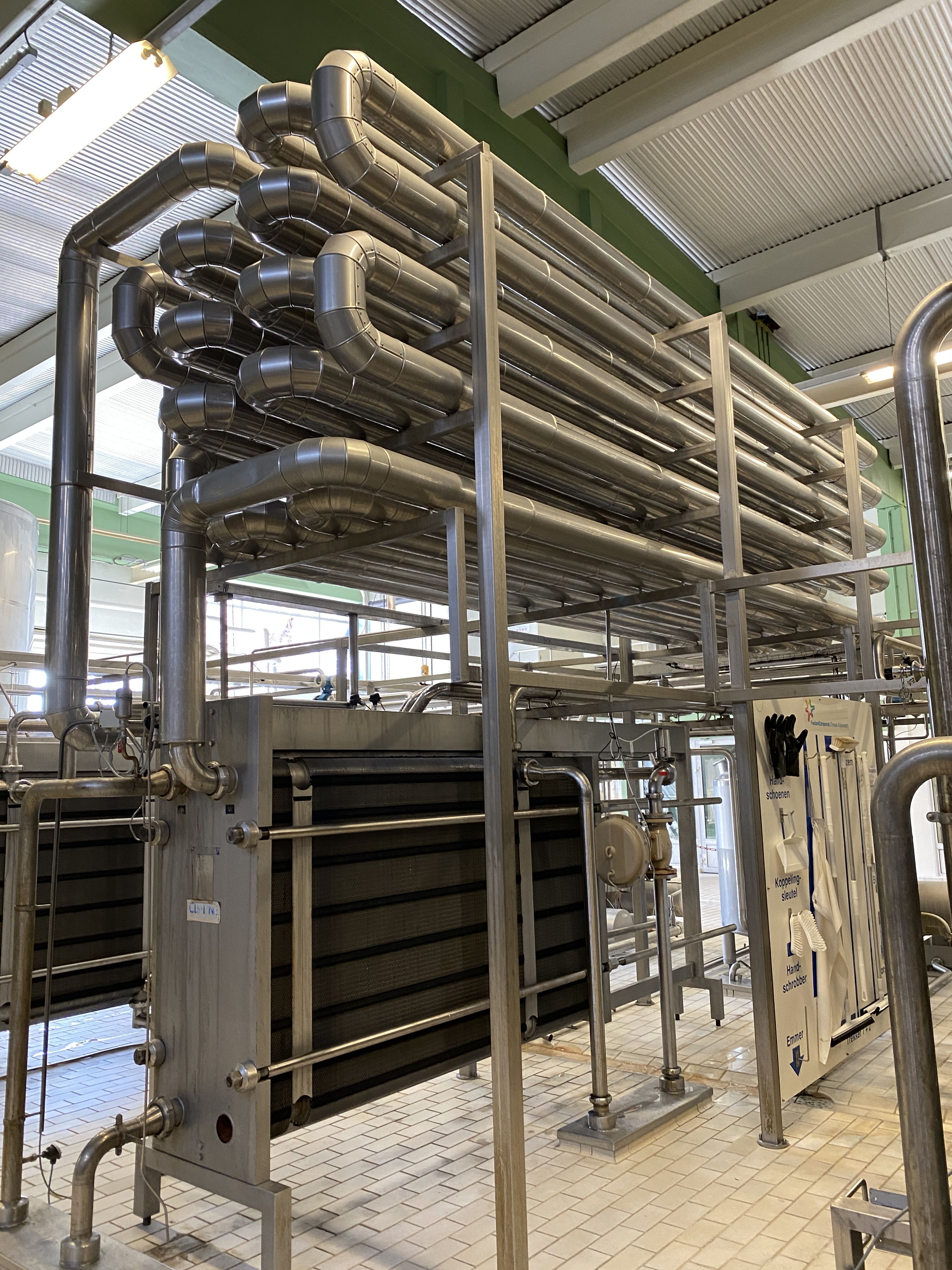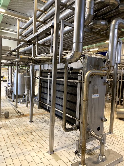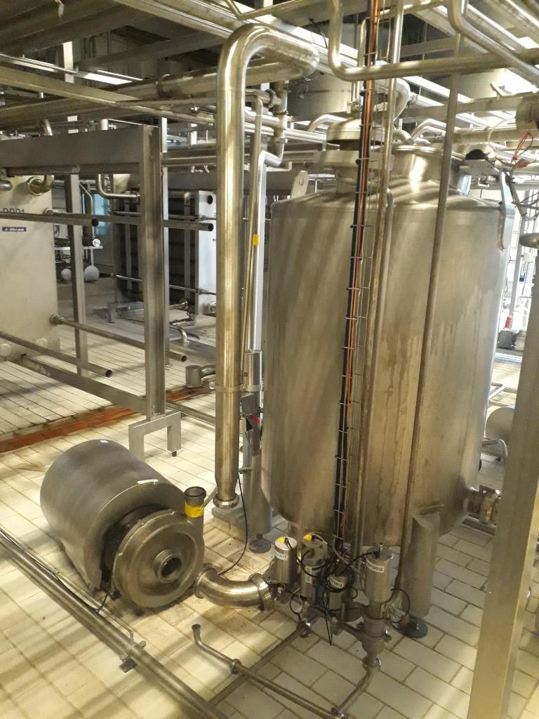 Milk thermisator/pasteuriser for Full fatt milk, full automatic. Exisiting out of: Centrifugal pump feed pump to the pasteuriser, inlet filter, Balance tank with 3 level sensors, spraybowl for cip, 3 level sensor. main pump (Alfa-laval model: LKH70/240 DMS 22kW with Flushed seal). Steam controlvalve (samson), steam/hotwater heatexchanger, condens trap, watercirculation pump (hot water set on separate skid). Plateheatexchanger, 4 section, 2x regeneration (block for connection of homogeniser or separator), heating and icwater cooling 4-55-65-4°C. Holding tube, approx of 300sec at 25T, insulated mounted on top of the heateschanger, size holding: 5 x 6 x 6mtr = 180mtr pipe, 4" = approx 1,400ltr = 200sec at 25T/h . Flowdiversion valve and all sensors, icewater valves (Samson). variable speed 25,000-37,000ltr/h at 25T upt to 95°C at 37T up to 65°C.