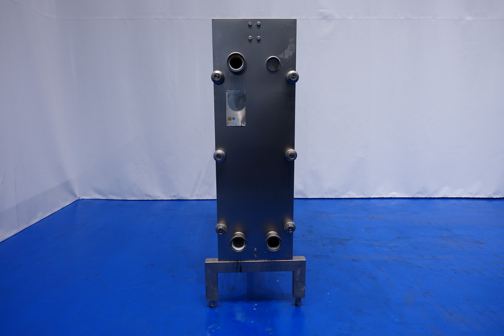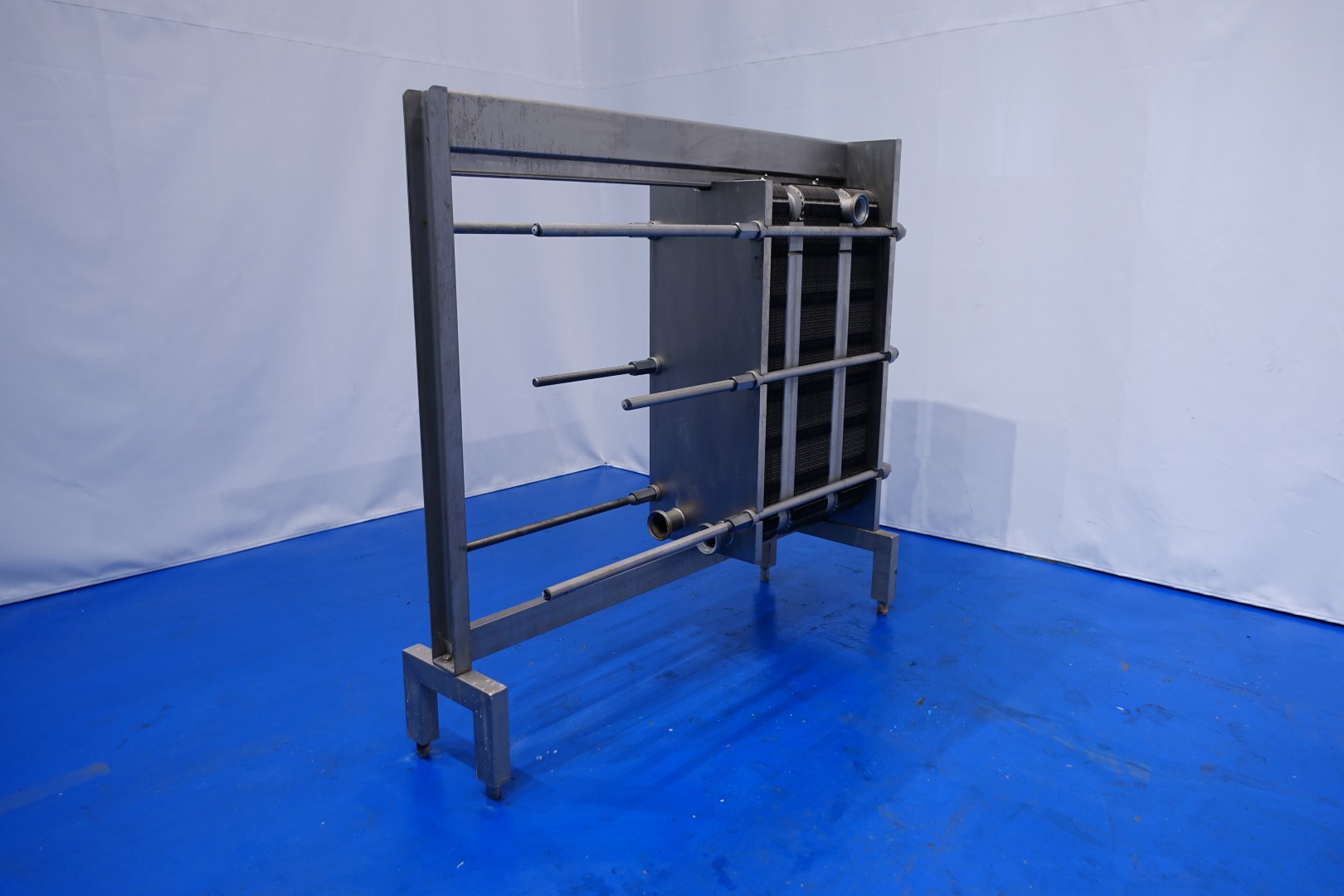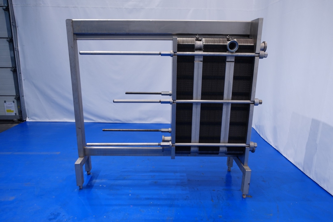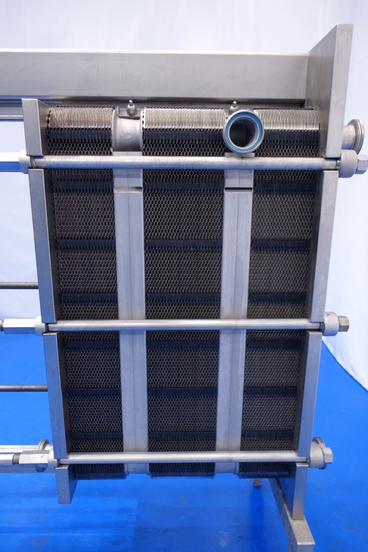 Plate heat exchanger, sanitary (PHE). Pressure: 10,0 bar - Beam length: 180 cm, connections: 8 x 3" DIN. Current configuration: 3 Sections: 37-48-36 plates (total 121) - Connections head: 1 up and 2 down, follower 2 down. Total dimensions: 200x67x186 (lxwxh) cm - weight: 980 kg.