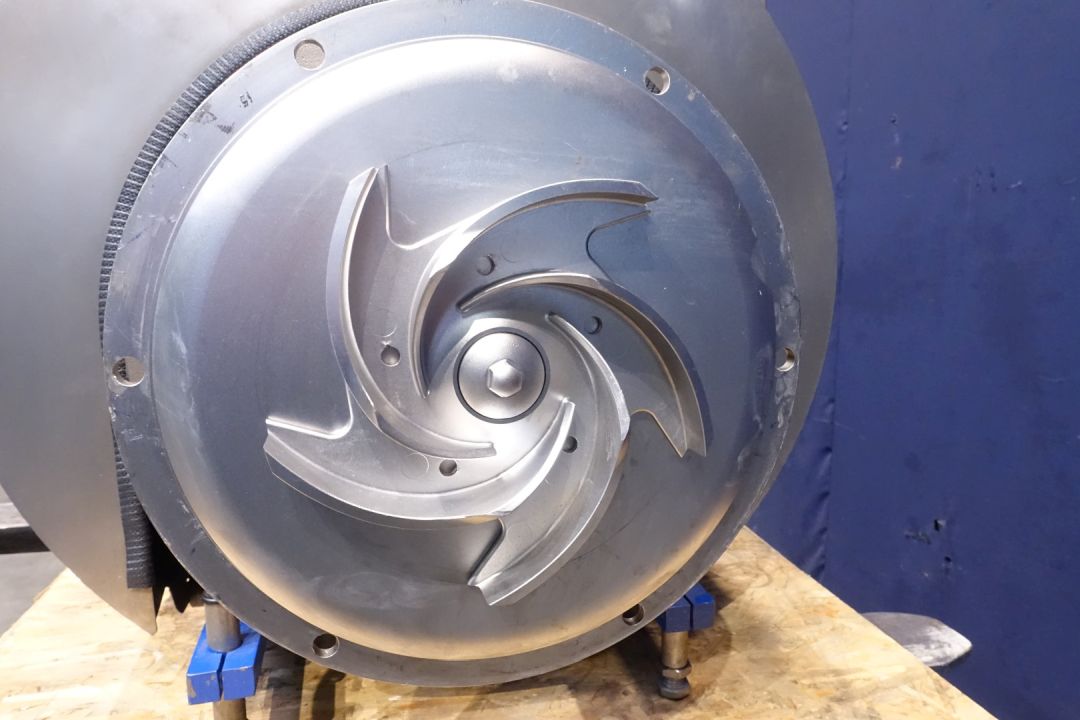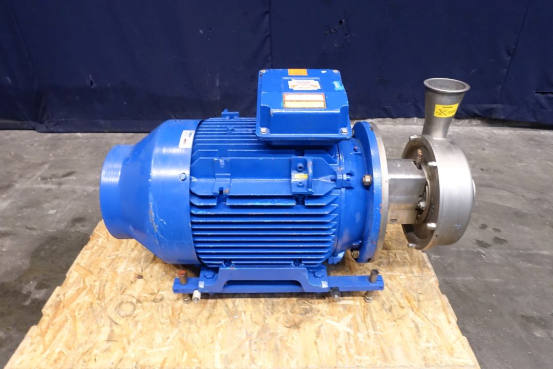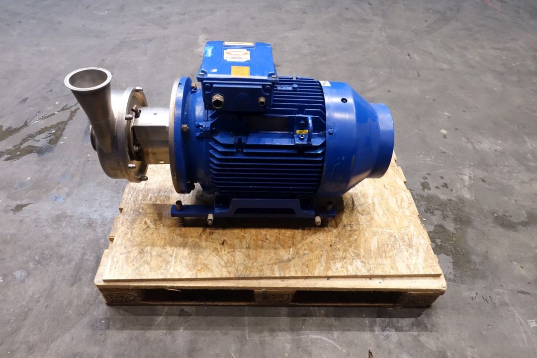 Sanitary centrifugal pump. Current motor: 30 kW - 55 A - 2940 rpm. Impellor diameter: 200 mm. Flushed seal. Capacity: 210 m3/h @ 2,2 bar - 100 m3/h @ 4,5 bar.Connections: 4'' / 4'', Clamp.