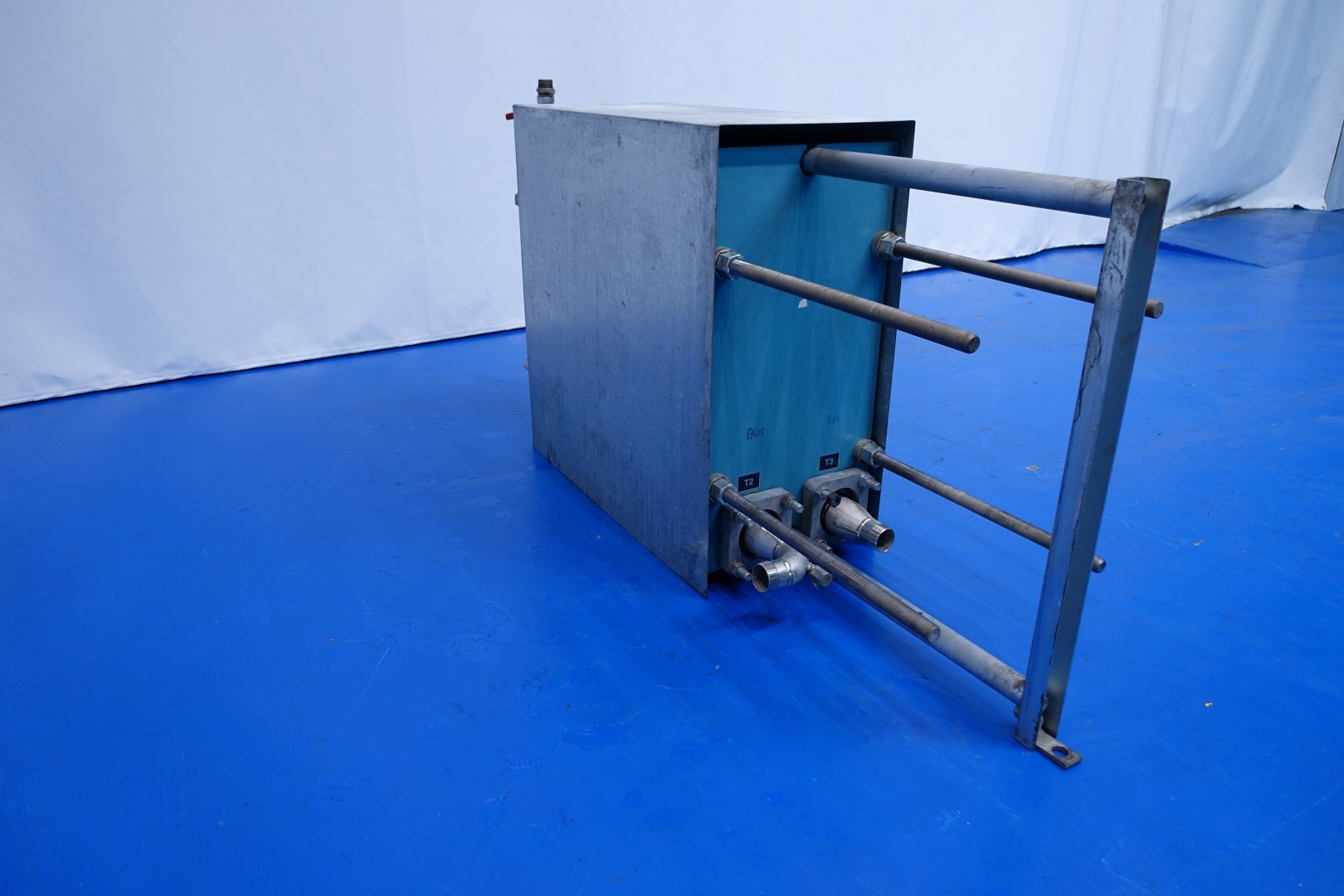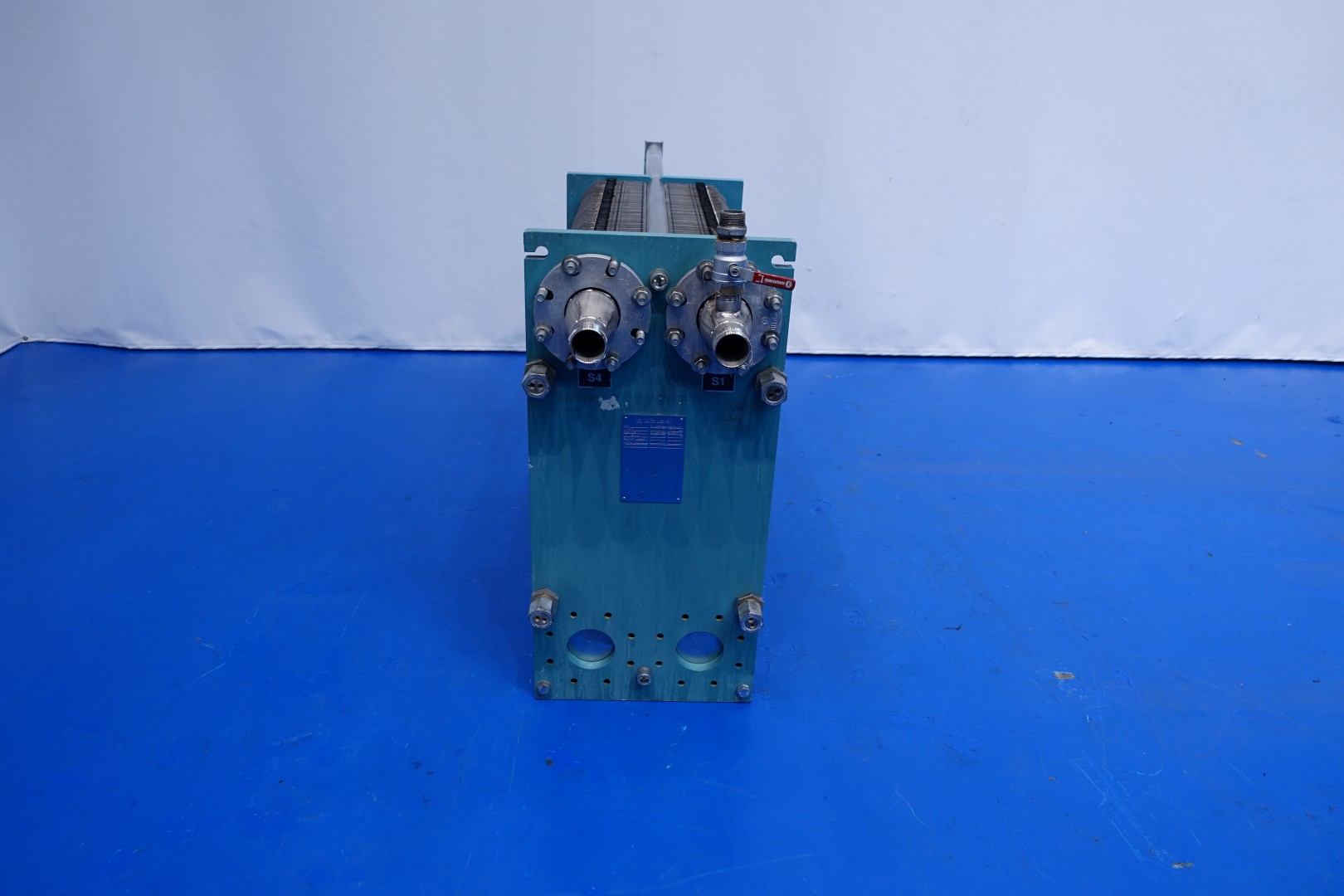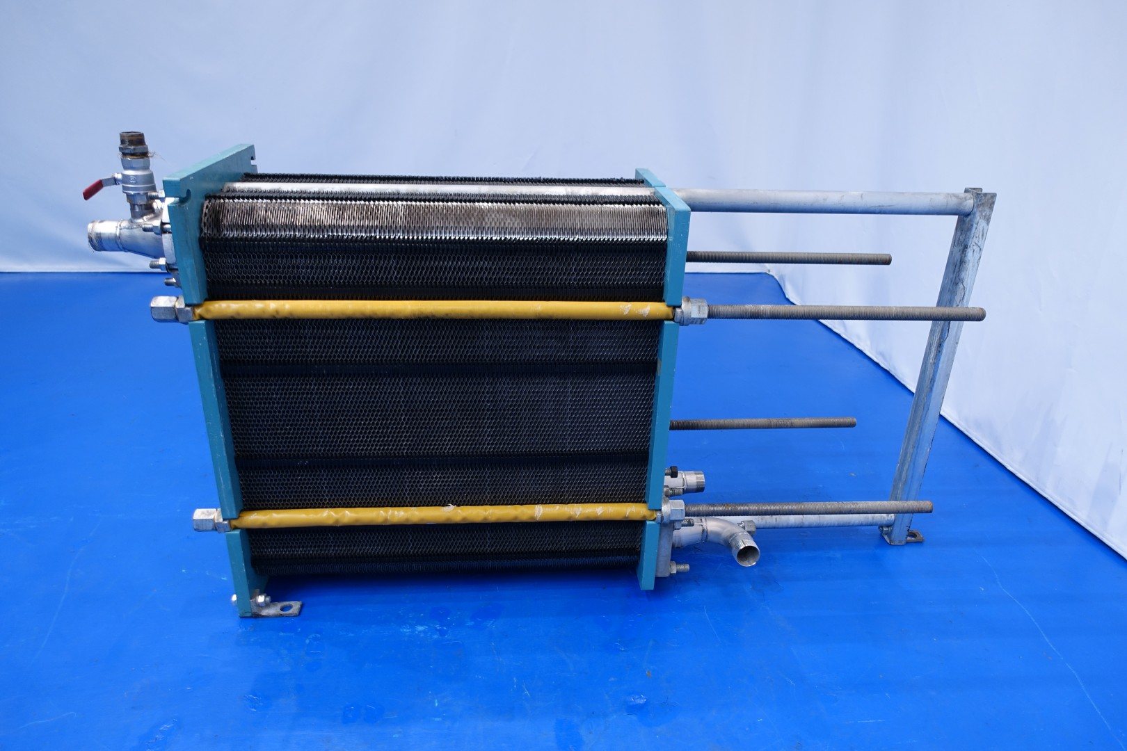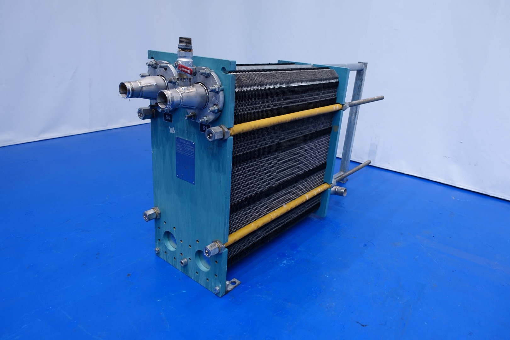 Plate heat exchanger, non sanitary (PHE). Pressure: 10,0 bar - Beam length: 160 cm, connections: 4 x pipe with thread Ø 60 mm and 1 x bypass pipe 40 mm. Current configuration: 1 Section: 200 plates - Connections head: 2 up, follower 2 down. Plate dimenions: 87x37 cm - thermal capacity 0,32 m2 in total 64,4 m2. Total dimensions 188x46x106 (lxwxh) cm - weight: 590 kg.