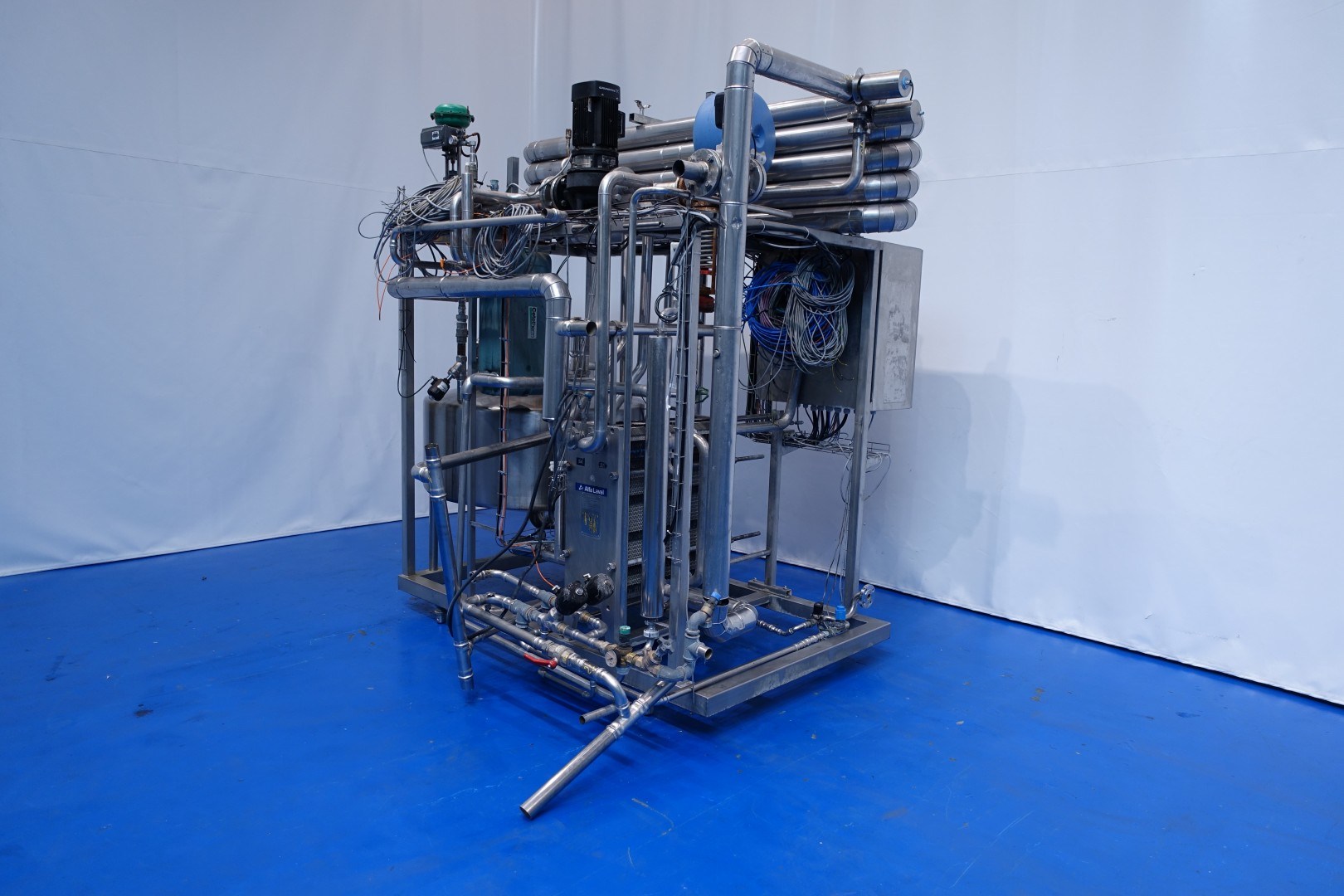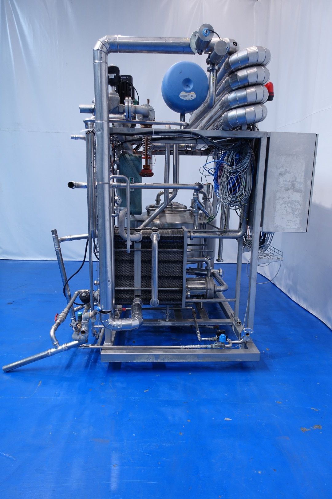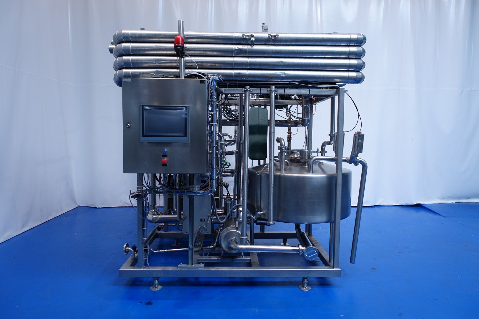 Skid mounted milk pasteurizer: Capacity: 7.000 l/h. Thermal cycle: in 4 → 55 (separator)→72 holding → 30°C. Balance tank, filter, pumps, heat exchanger Alfa-Laval M6, year: 1995, valves, control valve steam. Insulated holding on top of the skid. Controls of the pasteuriser (other part of factory) on one central Touch screen HMI Siemens TP 1500 mounted on the unit. Complete with documentation, layout, P&ID’s and software. Total dimensions (skid): 260x250x275 (lxwxh) cm - weight: 1.280 kg.