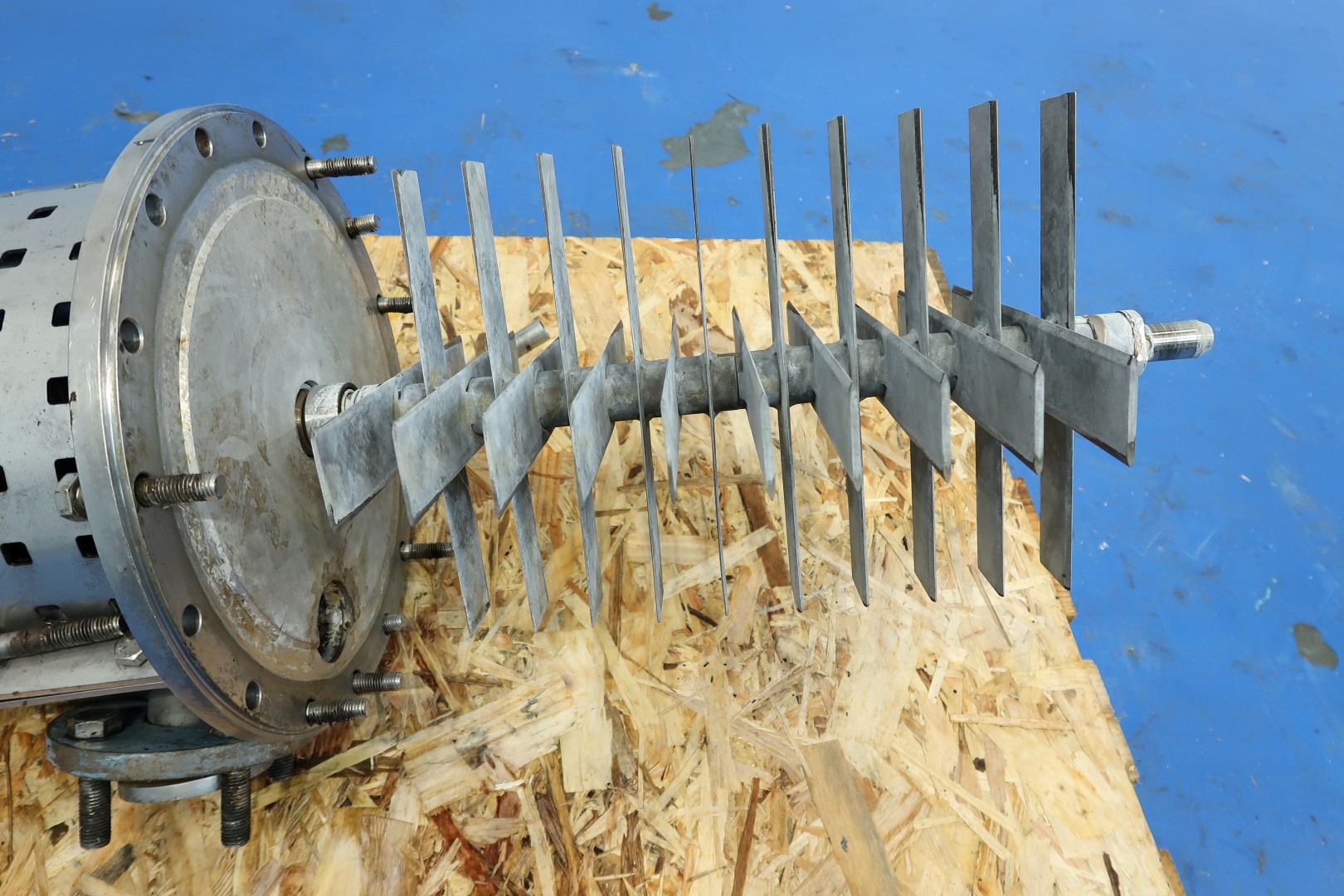 Inline mixer Previously used as a mixer for chemicals in vegetrable oil. With tracing around to keep product warm, capacity ca. 75 ltr, with 2x 20 knives. Inner dimensions; cylindrical height: 57 cm - diameter 29 cm. Outer dimensions: 42x38x136 (lxwxh) cm - weight: 165 kg.