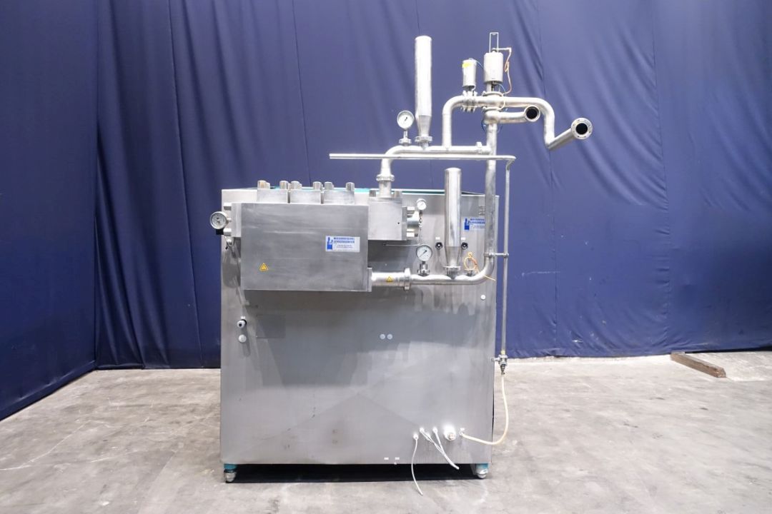 High pressure homogeniser. Previously used for milk. 1 Stage with hydraulic pressure control. Cone valves. 3 Pistons, piston diameter: 80 mm and stroke: 150 mm. Stainless steel cladded. Current motor power: 110 kW and maximum pressure in current confirguration with this motor 200 bar. Overpressure valve. Bypass valve. Manometer on in/outlet. Pulsation demper on inlet/outlet. Excluding controls. Reconditioned in 2014 by Lekkerkerker.