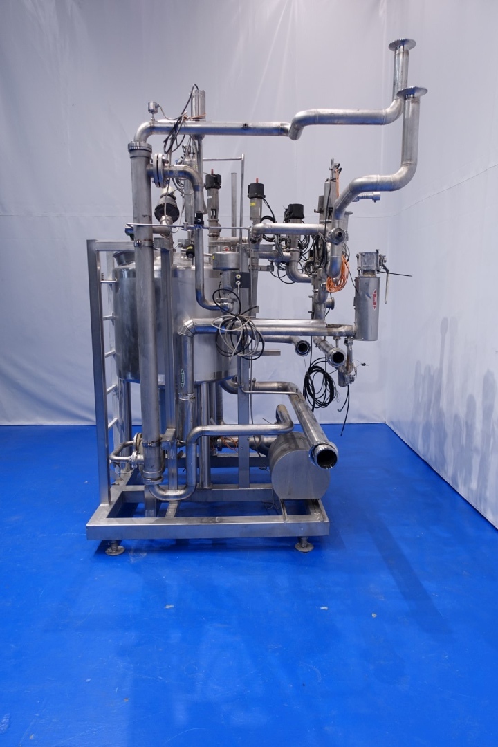 Skid mounted Cip unit which includes all items to make a CIP except the lye and acid tanks. included is a balance vessel, centrifugal pump, tubular heat exchanger, 2 x Siemens mass flow transmitter, valves and piping. Single jacketed balance vessel, capacity: 500 ltr with 2 x cip spray bowl. Alfa Laval LKH20/165 centrifugal pump - 5,5 kW - 2.880 rpm - impellor Ø 165 mm - connections in: 2,5" Din - out: 2,0" Din.capacity: 25m3 up to 3,5bar or 50m3 up to 2,5bar. Tubular heat exchanger Spiral flow multitube - tube length 196 cm - outer Ø 100 mm with 19 pipes of Ø 14 mm. Total dimensions: 210x190x281 (lxwxh) cm - weight: 630 kg.