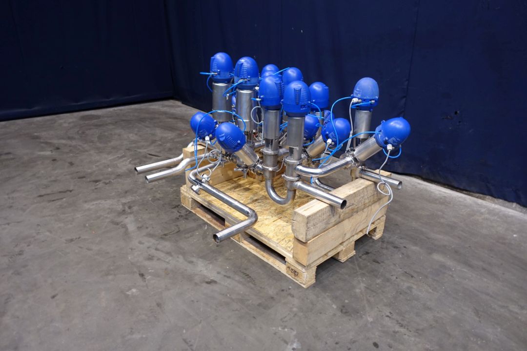 Valve manifold with 18x Alfa Laval valves: 8x Alfa Laval LK KA-t buttefly valves, 6x Alfa Laval SSV 3-way and 4x unique mixproof 4-way with seat lift. With 2 x sight glass by Bulls-eye. All valves with thinktops smart head All pneumatic activated. Diameter: 2" Weld-Weld. Dimensions: 140 x 130 x 80 cm - weigth 223 kg's. PID available used to split 2 incomming lines to 3 outgoing lines.