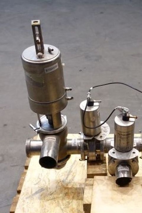Mixproof valve with seat lift. 4-Way. Butterfly stop valve between flanges. Pneumatic activated. Diameter: 3'' Weld-Weld / 3'' Weld-SMS. Single position sensor.