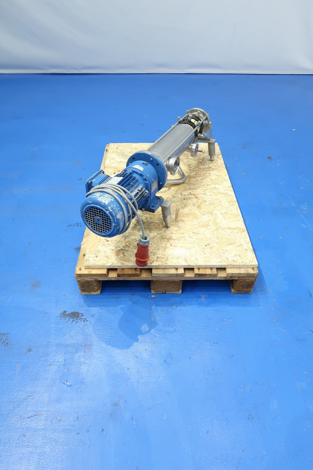 Eccentric screw pump. motor: 1,1 kW - 2,38 A - 50 Hz - n1 1.430 rpm - i = 10,56 - n2 pump speed 135 rpm. Mounted on 4 adjustable feet. Connections: (in) 3" Din / (out) 3" Din to 1,5" Din. Capacity estimated. Dimensions: 120x26x36 (lxwxh) cm - weight: 60 kg.