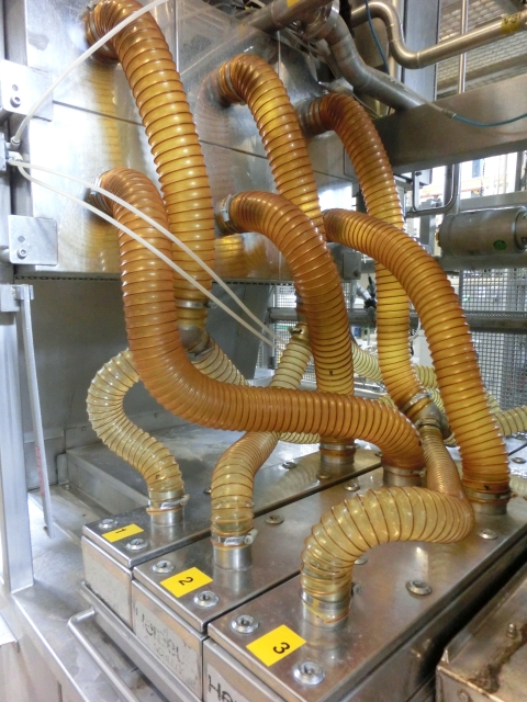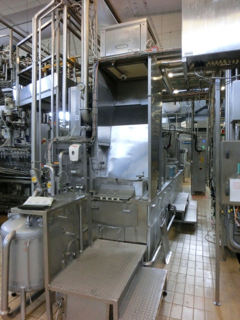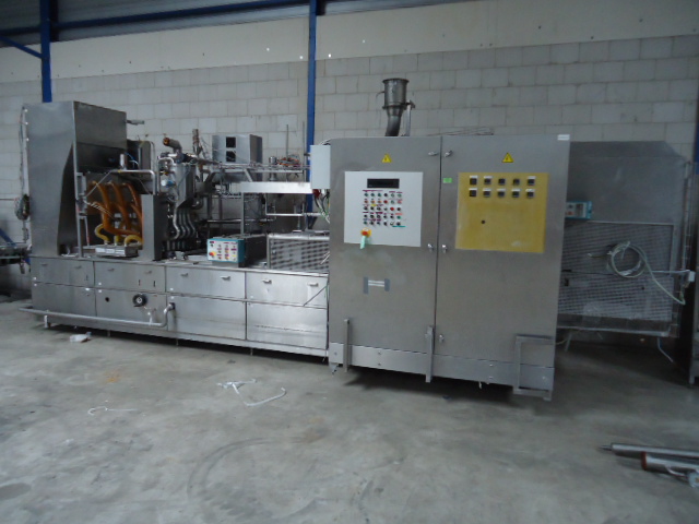4 Lines, Cup filling and sealing machine for viscous products like yoghurt. Cup diameter 75 and 95 mm, double plates for automatic format change by moving chain 1 step forward or backward. Cup decontamination by UV light (air cooled Heraeurs cassetes) , main doser 100 - 550 ml (CIP cleanable), lid sealing and packer (only gripper 3x4, 95 mm). Control panel with Siemens S5 PLC. Dimensions filling machine only: length (without outfeed conveyors) 509 cm - width (without outfeed conveyors) 171 cm - heigth (max) 370 cm. Width +/- 8.000 kg.