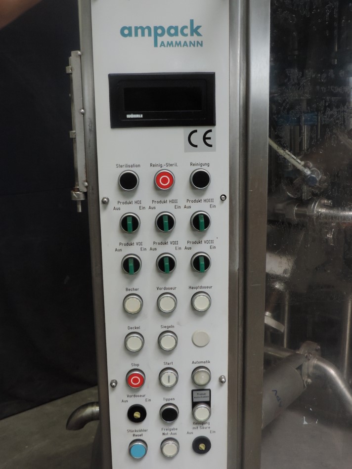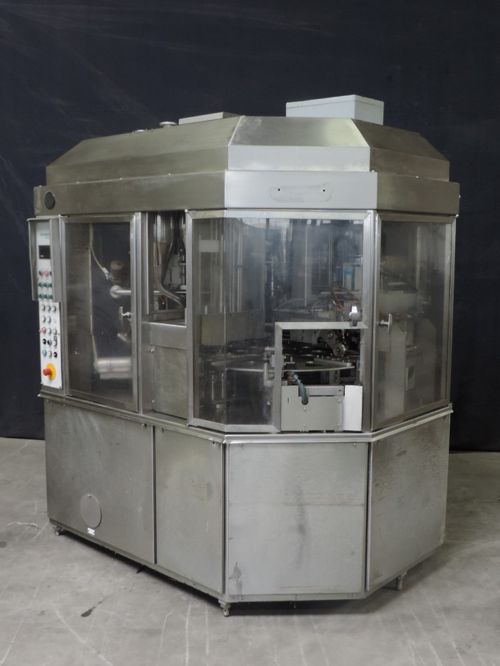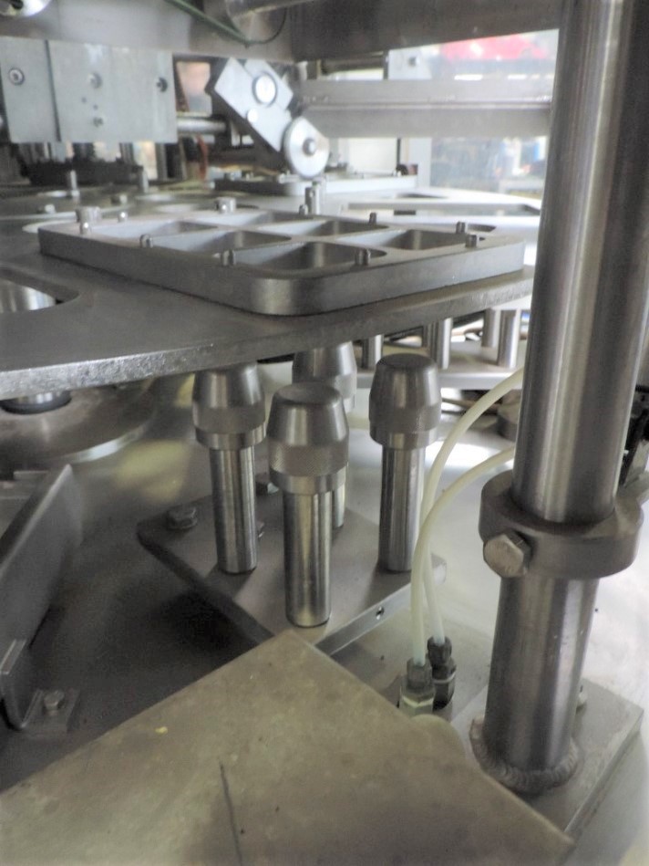 Rotary filler, with 6 Heads, cup size rectangular 6-pack: 146 x 195 mm. Format per cup rectangular: 73 x 65mm. Could also run a 4 pack with this format. Stations: Cup destacking, Pre-doser (100-400 ml), Main-doser (100-400ml) Pistondoser for viscose/thinliquid products. With hopper, Seal dispending by vacuum, heat sealing, riller for easy breaking, outfeed to conveyor. Easy format change. Controls: Siemens model: S5. Documentation available. Total dimensions: 180 x 200 x 240 cm. Excluding outfeed conveyor, 6 formats and a 1 ripper.