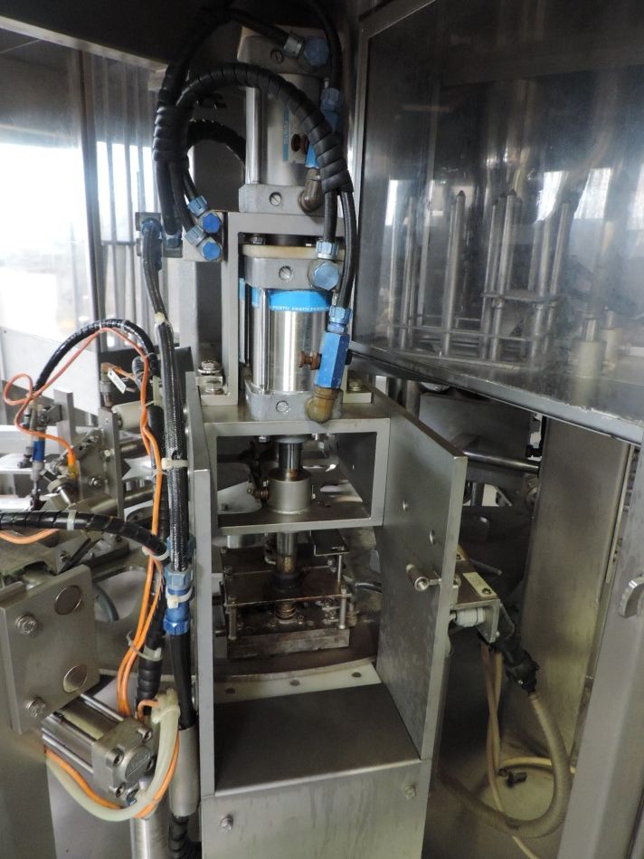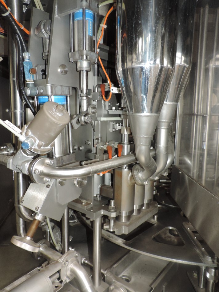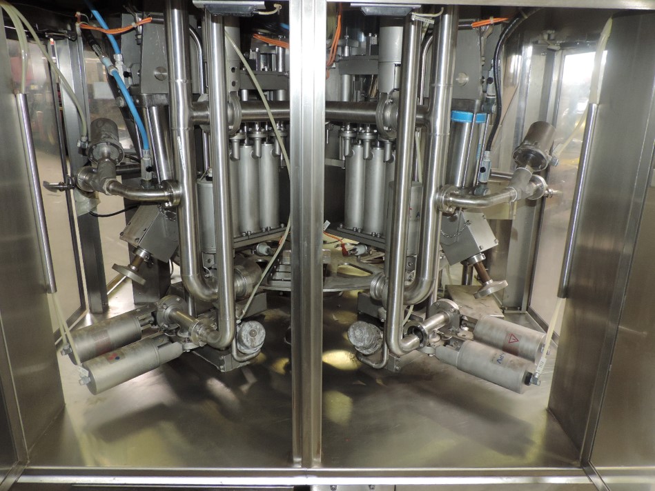 Rotary filler, with 6 Heads, cup size rectangular 6-pack: 146 x 195 mm. Format per cup rectangular: 73 x 65mm. Could also run a 4 pack with this format. Stations: Cup destacking, Pre-doser (100-400 ml), Main-doser (100-400ml) Pistondoser for viscose/thinliquid products. With hopper, Seal dispending by vacuum, heat sealing, riller for easy breaking, outfeed to conveyor. Easy format change. Controls: Siemens model: S5. Documentation available. Total dimensions: 180 x 200 x 240 cm. Excluding outfeed conveyor, 6 formats and a 1 ripper.