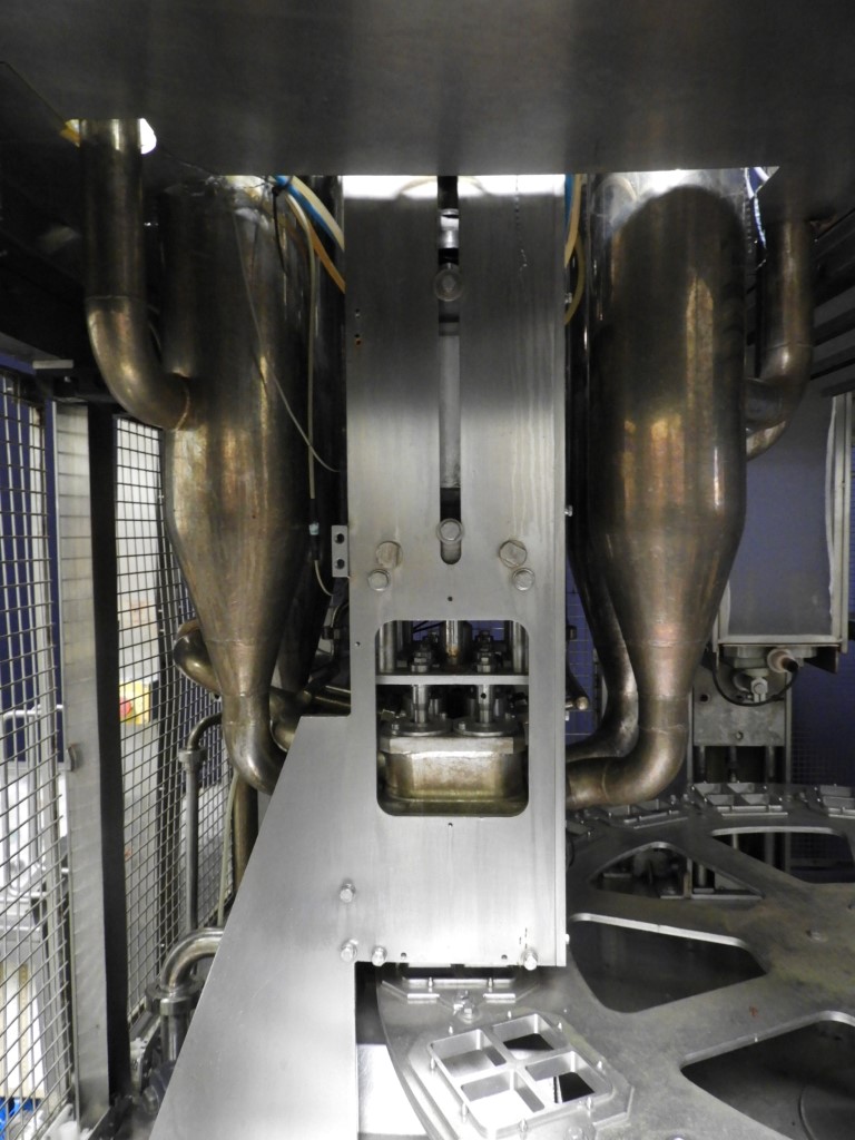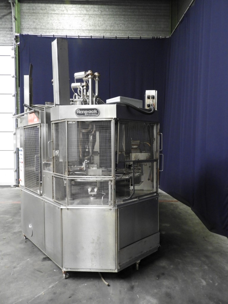 Rotatry cup filler with 4 filling heads. 8-Steps. Cup size: square 4-pack, 130x130 mm. Format per cup: square 55x55 mm. Stations: cup destacking, main piston doser (100-approx 220 ml) for viscose products (CIP cleanable), seal dispending by vacuum, heat sealing and outfeed station. Excluding outfeed conveyor. Machine has plexiglas safety guards. Machine is with an hepa air system with blower. Easy format change possible. Reading desk control panel with controls: Siemens S5. Total dimensions machine 200 x 190 x 280cm. Control panel: 130 x 50 x 260cm.