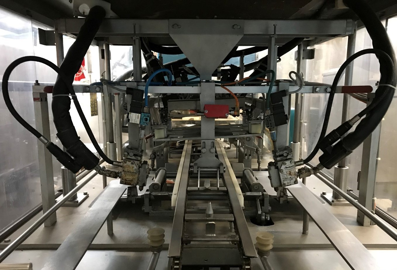 Automatic tray erecting and forming machine for closed trays for 4x5 = 20cups of Ø 75 mm. Including Nordson 3500 hotmelt glue unit with 4 hoses, 4 glue points. Tray size plano 880 x 380 mm. The trays are formed in 3 steps. Maximum speed: 25 trays/minute. Total dimensions: 3,2 x 1,1 x 1,75 mtr.