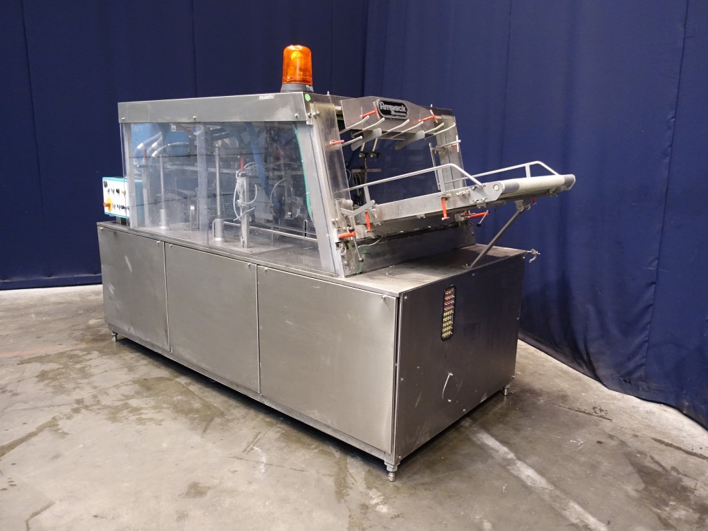 The correct number of this machine is STN14008. Automatic tray erecting and forming machine for closed trays with Nordson Pro Blue 10 hotmelt glue device with 5 hoses and 9 glue points. Tray size standard 3 x 4: 95 mm, ± 29,5 x 37,5 cm. The trays are formed in 3 steps. Siemens Simatic S5 controls. 19.772 working hours. Total dimensions: 340 x 130 x 190 cm. Weight: 900 kg. Users manual, sparparts list and elektical scheme in German language.