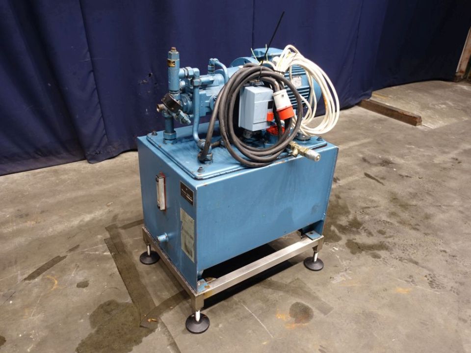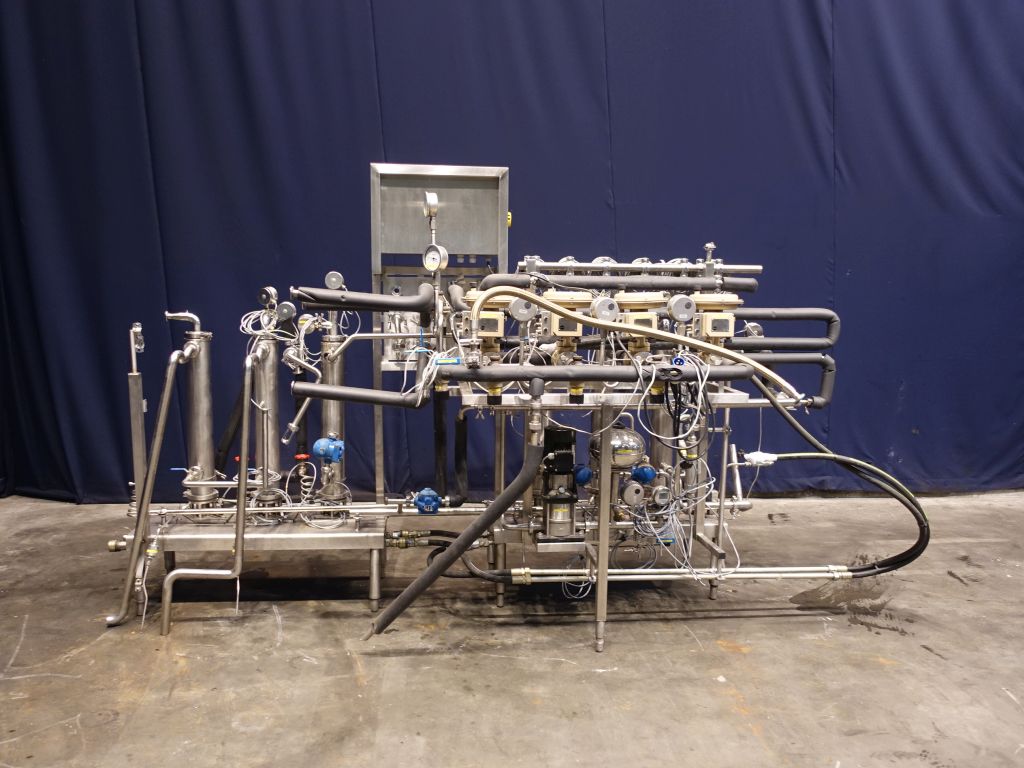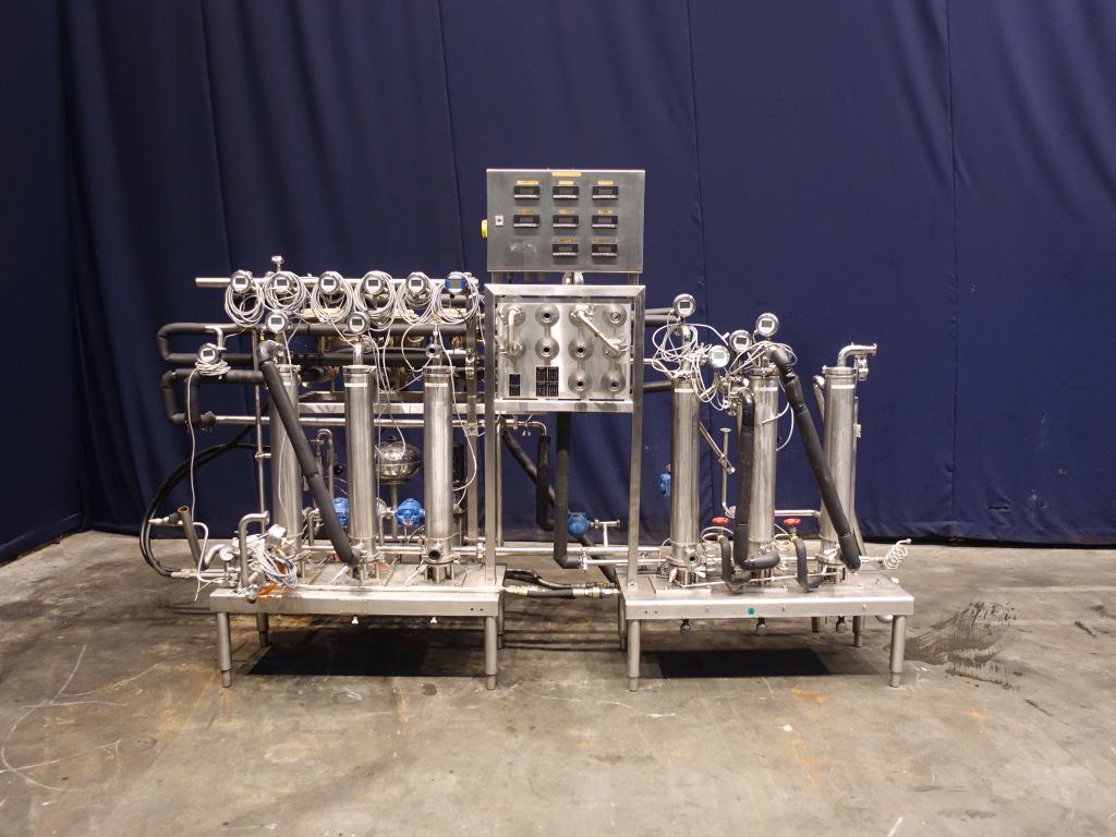 Scraped heater - cooler set, used as steriliser, including 3 holding tubes 30 - 30 - 210 seconds (various options possible on swingbend panel). Each scraped heaterexchanger has a temperature indicator on water and product. 2x Sets of APV Crepaco 3VT422 scrape surface heatexchangers, vertically mounted, diameter tube approx 10 cm, diameter rotor 3,5 cm, length of tube 65 cm, 2 scrapers on the rotor. 1 skid with heaters (by steam indirect), each unit has its own control valve (Samson) and temperature controller in the electronic panel, 1 skid with 3 tubes used as cooler. Scrapers hydraulic (oil pressure) driven, separate hydro set included (5,5 kW). Dimensions skids: 410 x 180 x 210 cm, hydro unit: 90 x 70 x 110 cm.