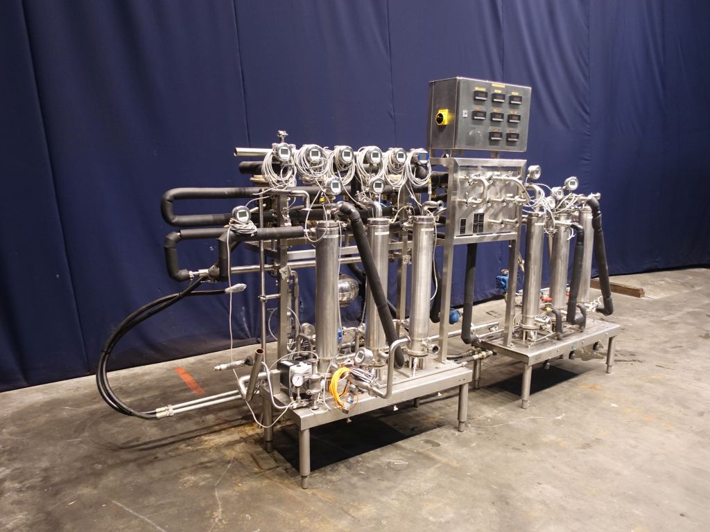 Scraped heater - cooler set, used as steriliser, including 3 holding tubes 30 - 30 - 210 seconds (various options possible on swingbend panel). Each scraped heaterexchanger has a temperature indicator on water and product. 2x Sets of APV Crepaco 3VT422 scrape surface heatexchangers, vertically mounted, diameter tube approx 10 cm, diameter rotor 3,5 cm, length of tube 65 cm, 2 scrapers on the rotor. 1 skid with heaters (by steam indirect), each unit has its own control valve (Samson) and temperature controller in the electronic panel, 1 skid with 3 tubes used as cooler. Scrapers hydraulic (oil pressure) driven, separate hydro set included (5,5 kW). Dimensions skids: 410 x 180 x 210 cm, hydro unit: 90 x 70 x 110 cm.
