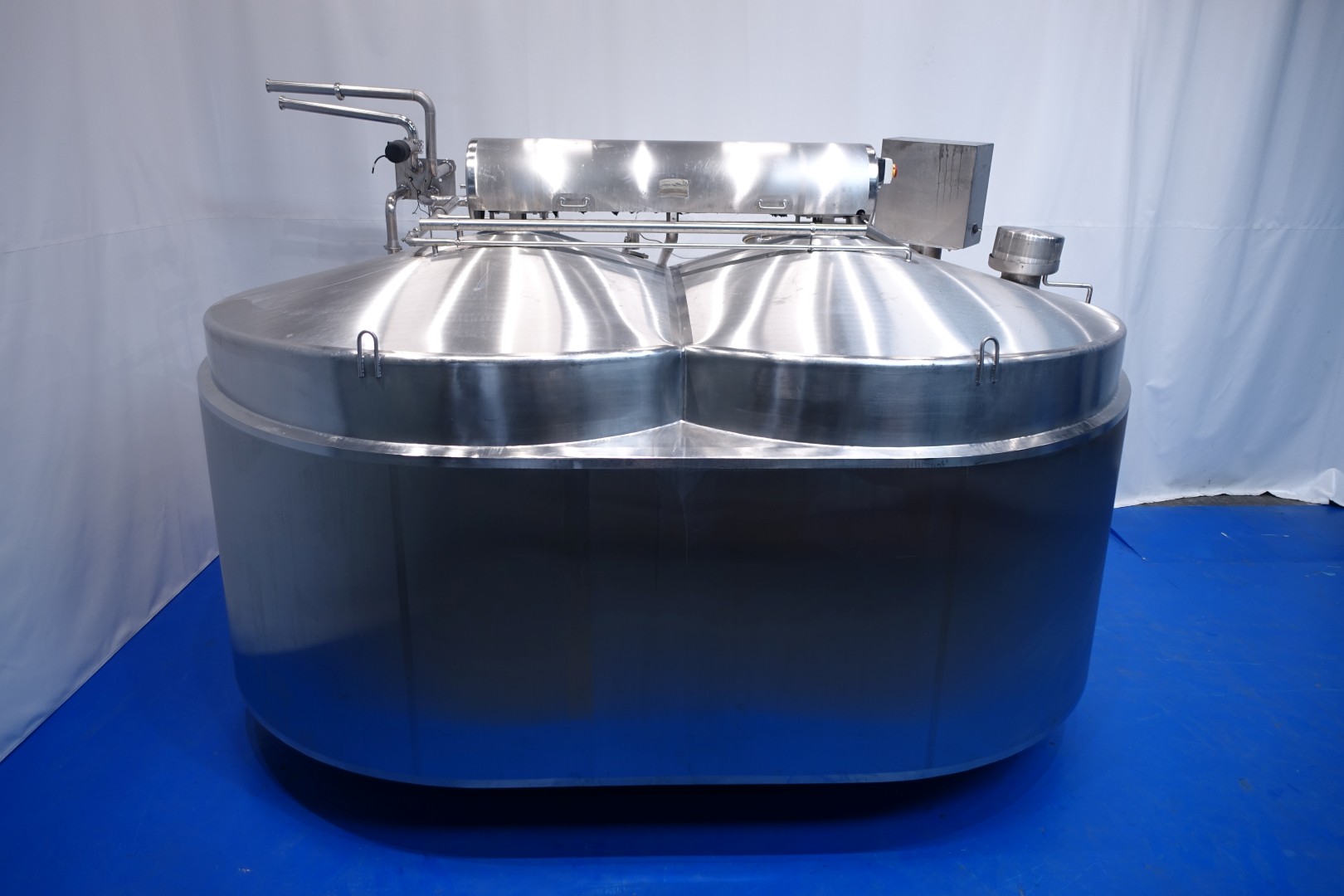 APV CurdMaster Cheese Vat 18.000 liter. Specifically designed for the producing of high- quality cheese curd and whey. The vat is suitable for the producing of most cheese types ranging from hard and semi hard varieties like Gouda, Cheddar, Edam, Tilsiter etc, to soft/fresh varieties like Blue Cheese and Feta as well as Pasta Filata. Stainless steel vat, double jacketed and insulated. Manhole with grid and sensor, light. Whey suction through the side of the vat on 75-50% of volume. Sensors for pressure (for volume), and temperature. Breather with protection raster, steam connecting to the double jacket to heat the curd during the process.. 2 x outfeed pneumatic butterfly valves. CIP cleanable by spray-balls. Complete with piping and infeed/outfeed valves. Control panel and operation panel on vat to control agitator speed, temperature, and whey – curd valves Total dimensions: 460x380x308 (lxwxh) - weight vat: 3.050 kg - leg/feet weight: 400 kg.