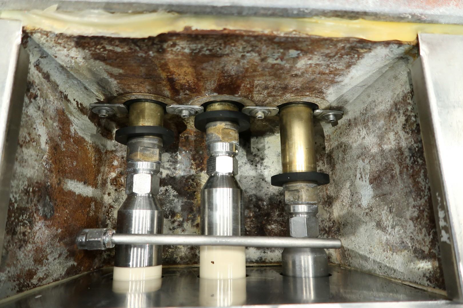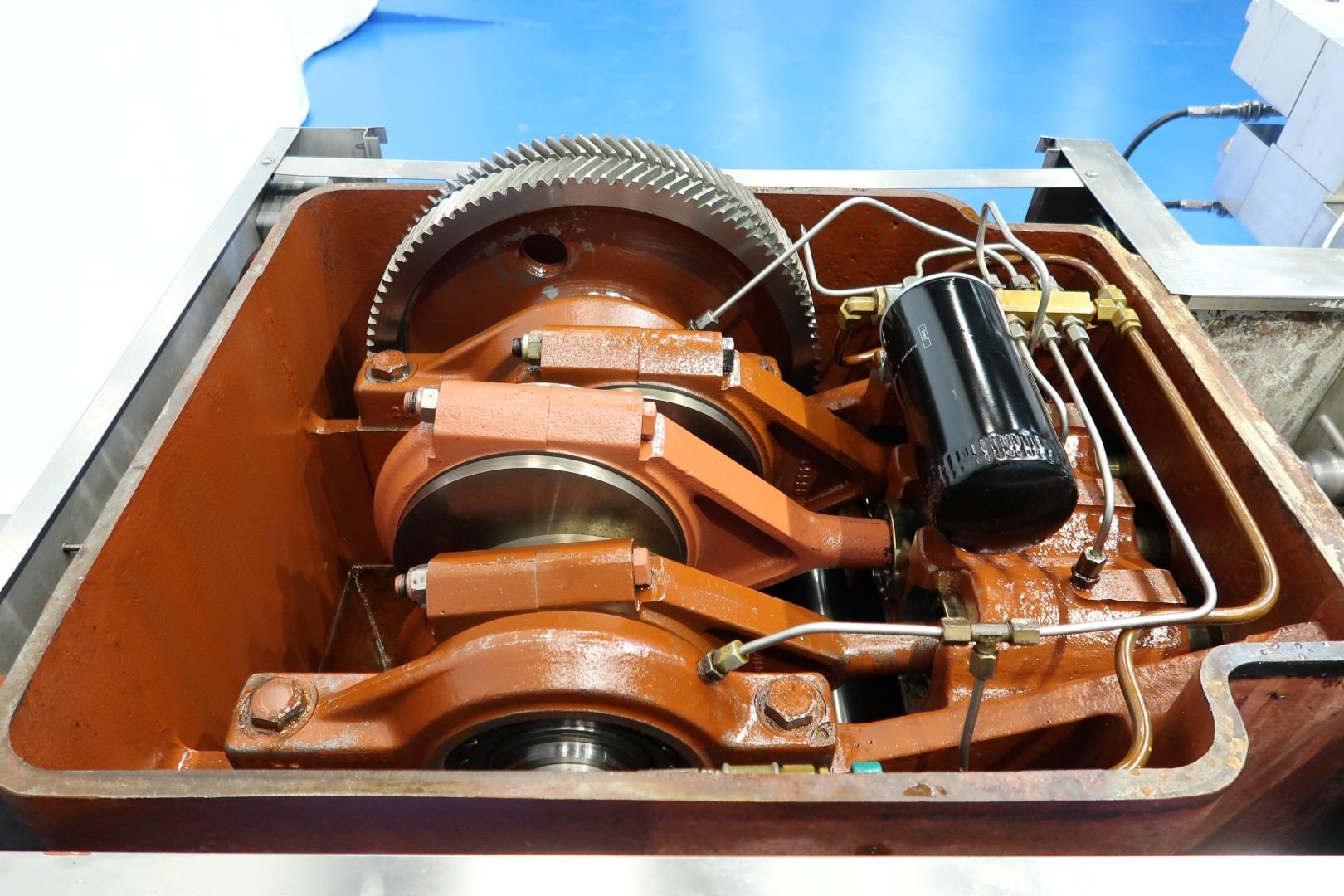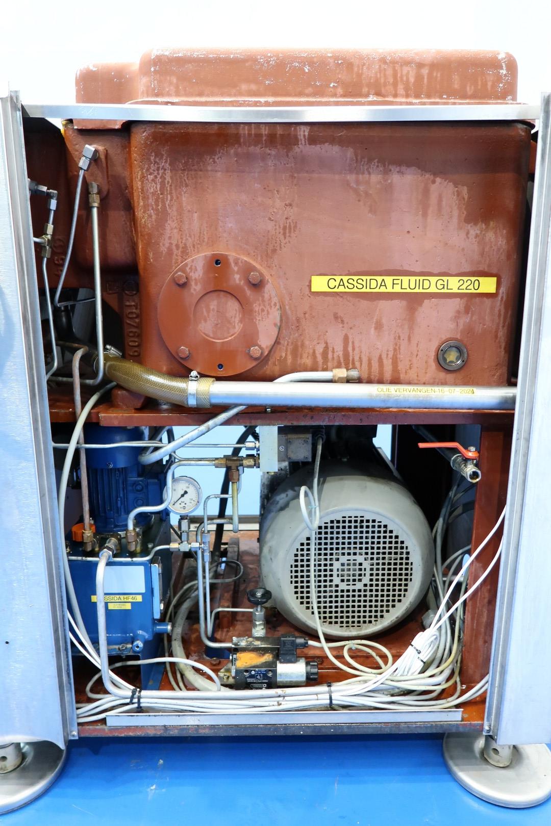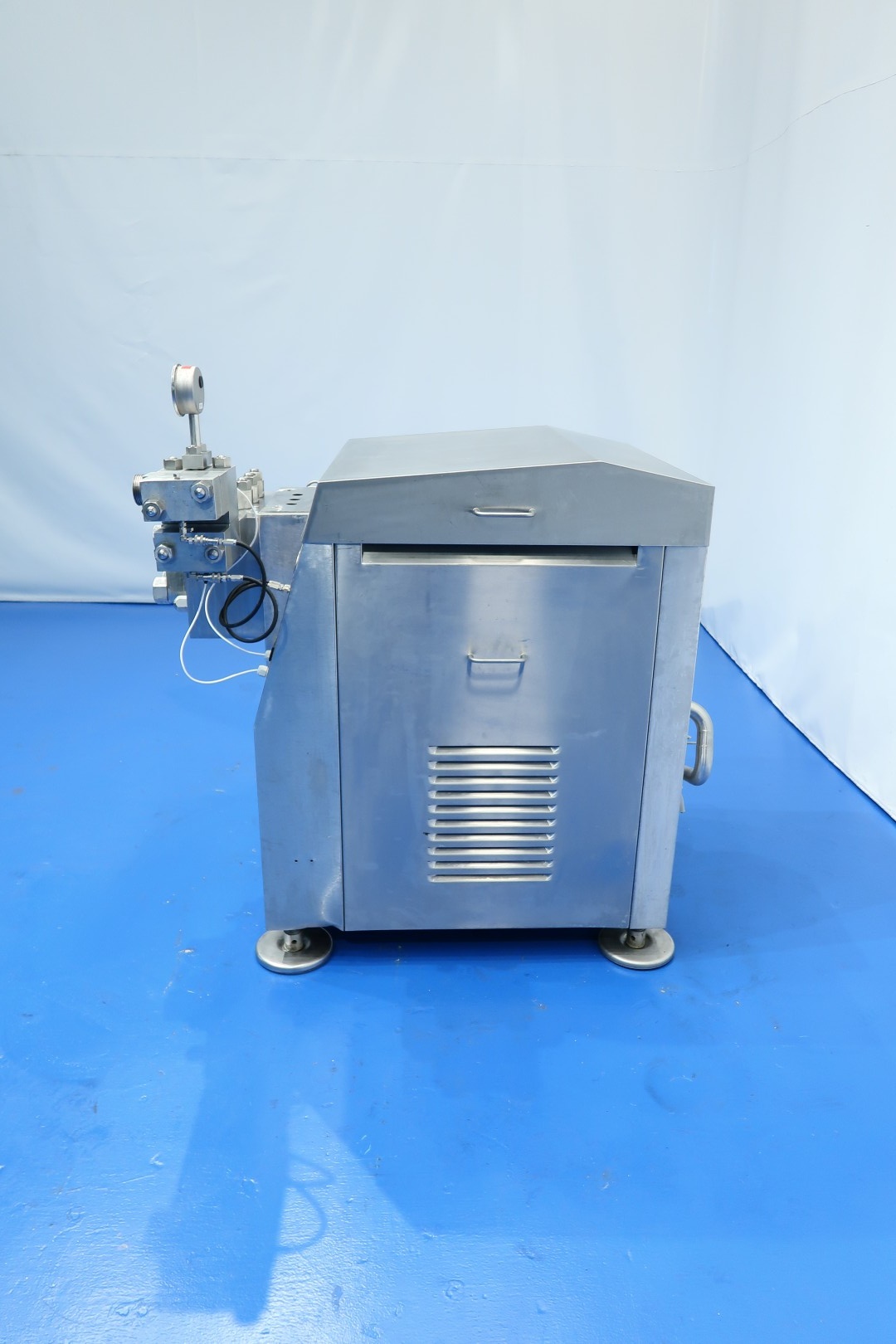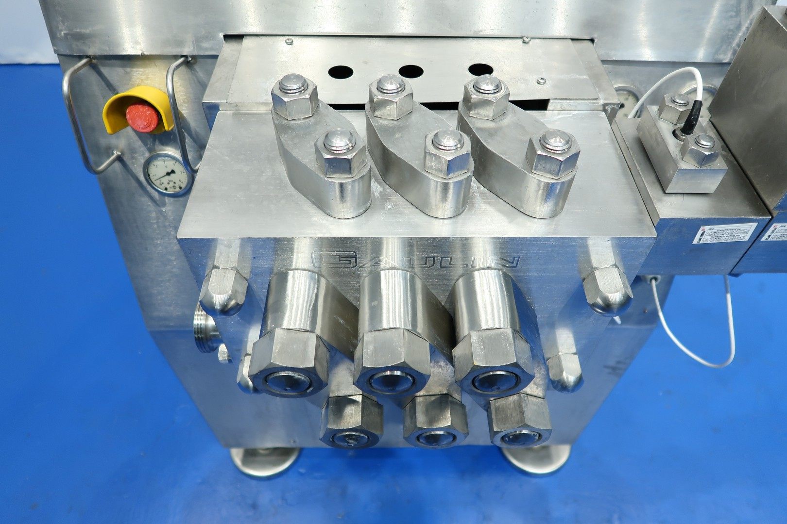High pressure homogeniser, 2 stages with ball valves and ceramic pistons special for viscose and abresive products or products with fibers/small particles, hydraulic pressure control. 3 Ceramic Pistons, diameter: 49,2 mm (1 15/16"). Connections in DN50 Din and out DN40 Din. Current motor power: 18,5 kW and maximum pressure in current confirguration with this motor 140 bar (possible to adap to 210bar / 2500ltr by pouly change) . manometer on highest pressure + 2 Electronic pressure transmitter 1st and 2nd stage with read out display in the machine. oil circulation pump and hva pump with oil coolers and flowswitch on cooling water. Total dimensions: 147x98x146 (lxwxh) cm - weight: 1.265 kg.