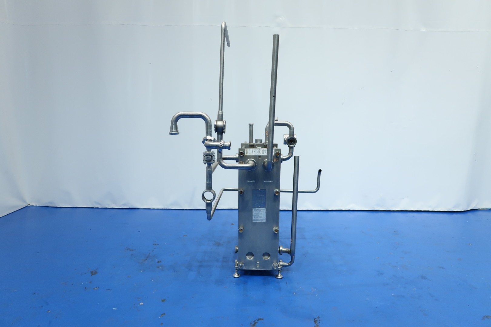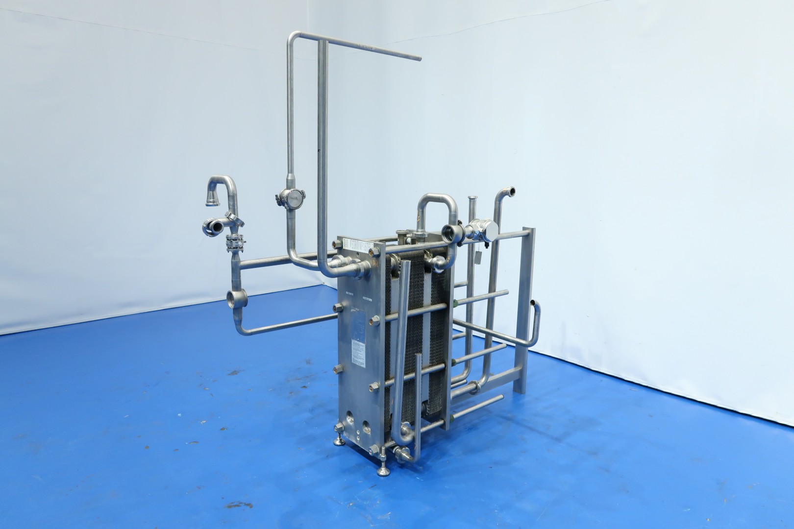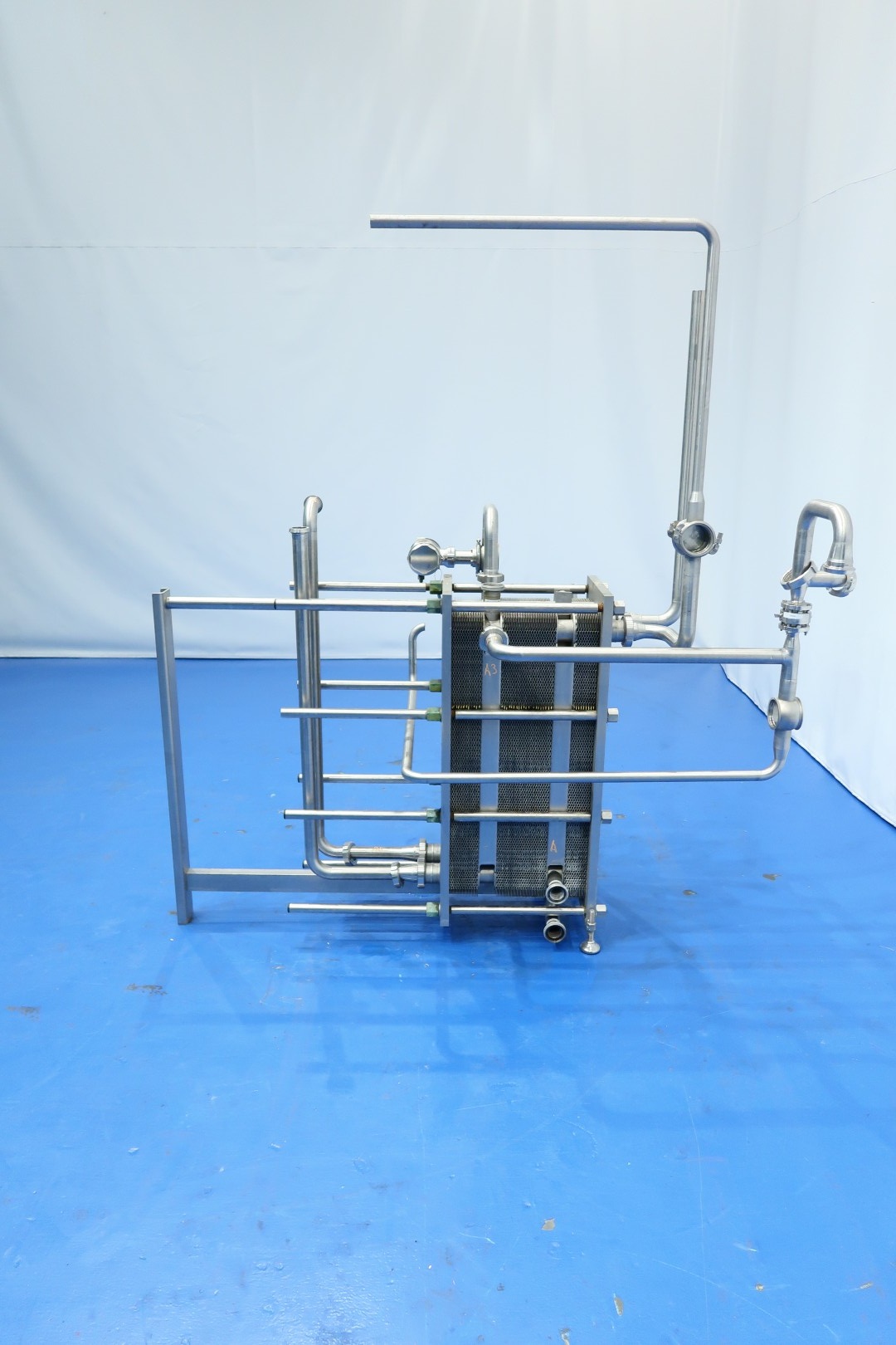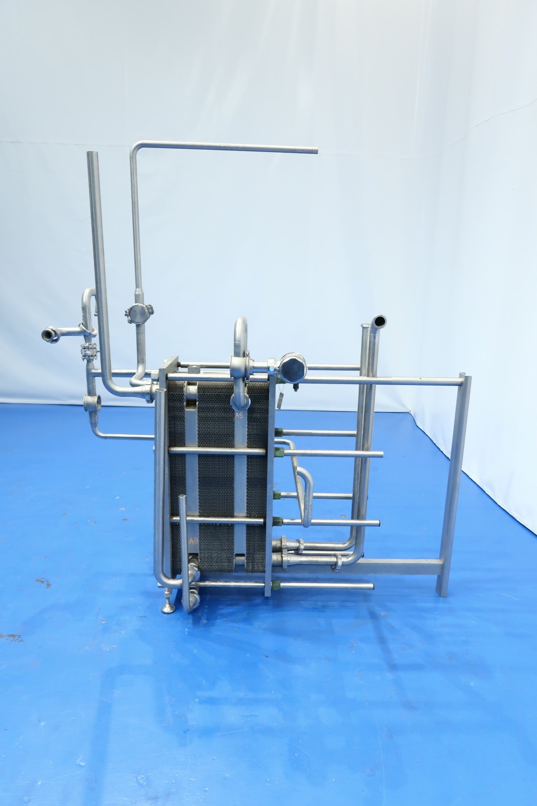 Plate heat exchanger, sanitary (PHE). Working pressure: 10,0 bar. Beam length: 120 cm, connections: 4x 2,5" Din and 8x 2" Din. Current configuration: 3 Sections: 19-43-25 (total 87) plates - Connections head: 2 up, follower 2 down. Total dimensions: 185x98x194 (lxwxh) cm - weight: 280 kg.
