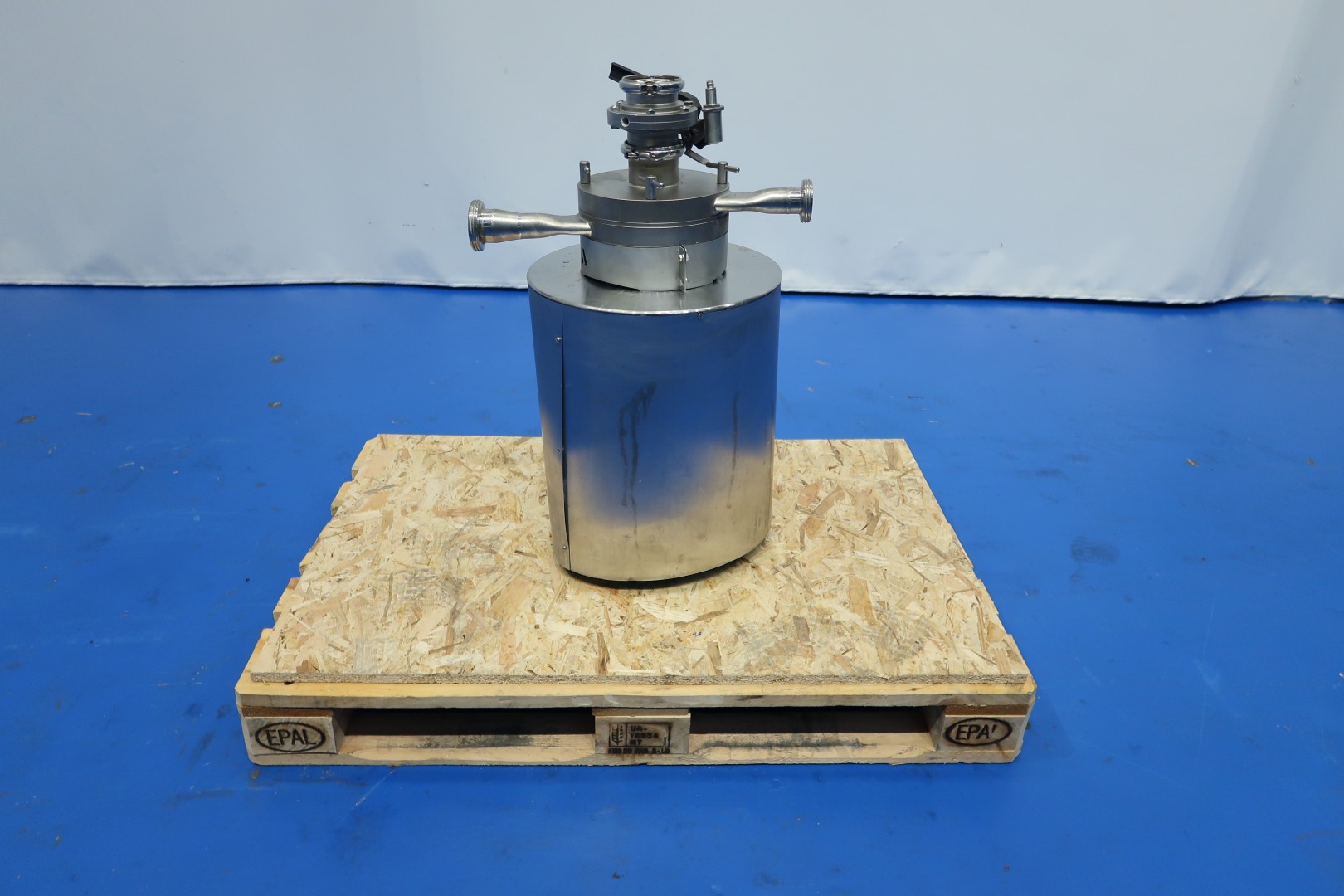 Powder dissolver with hopper with cover. Hopper volume ca. 100 liter. Order no. 27150591. Impellor size 170 mm. Motor: 7,5 kW - 13,9 rpm, 50 Hz - 2.915 rpm. With manual butterfly valve on infeed under hopper. The powder mixer can be used in any situation where powder is first added and then dissolved in liquid. Milk powder: 60 kg/min, whey powder: 75 kg/min, lactose: 150 kg/min and sugar: 130 kg/min. Connections: (in) 2" Din - (out) 1,5" Din. Dimensions: 80x80x140 (lxwxh) cm - weight: 120 kg.