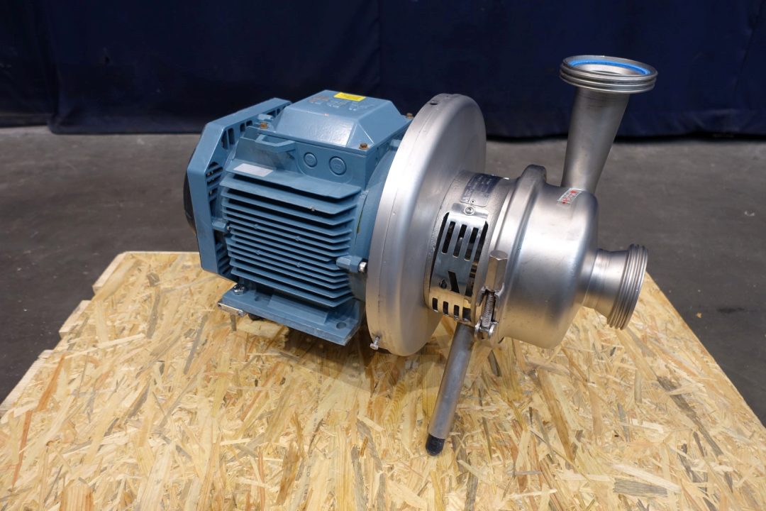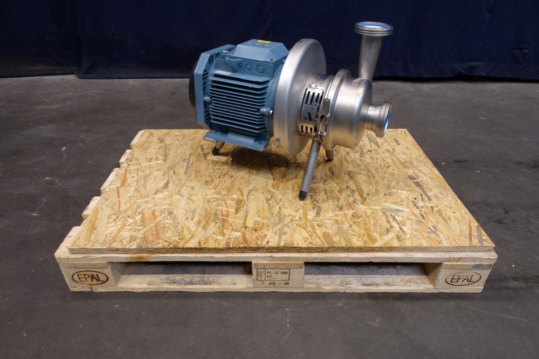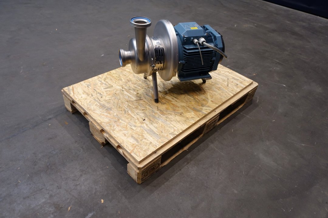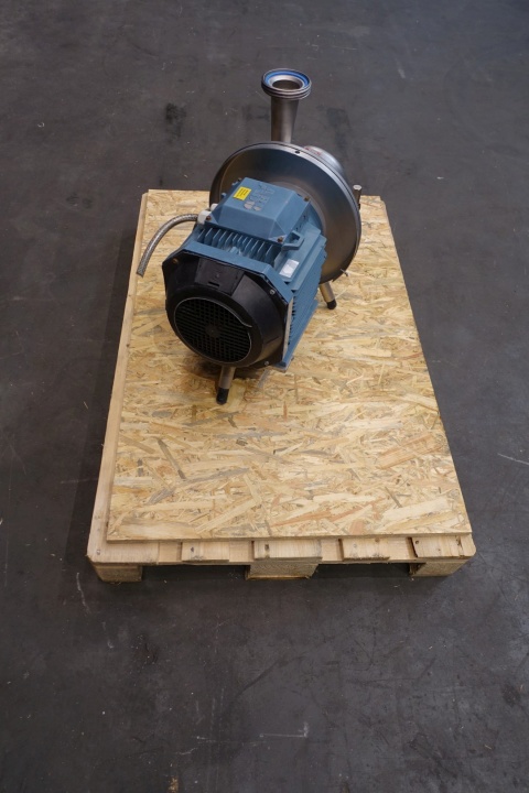 Sanitary centrifugal pump. No typeshield on motor. Impellor diameter: 180 mm. Order no.: 27140589. Connections: (in) 4" Din / (out) 4" Din. Dimensions: 61x36x50 (lxwxh) cm, weight: 90 kg's.