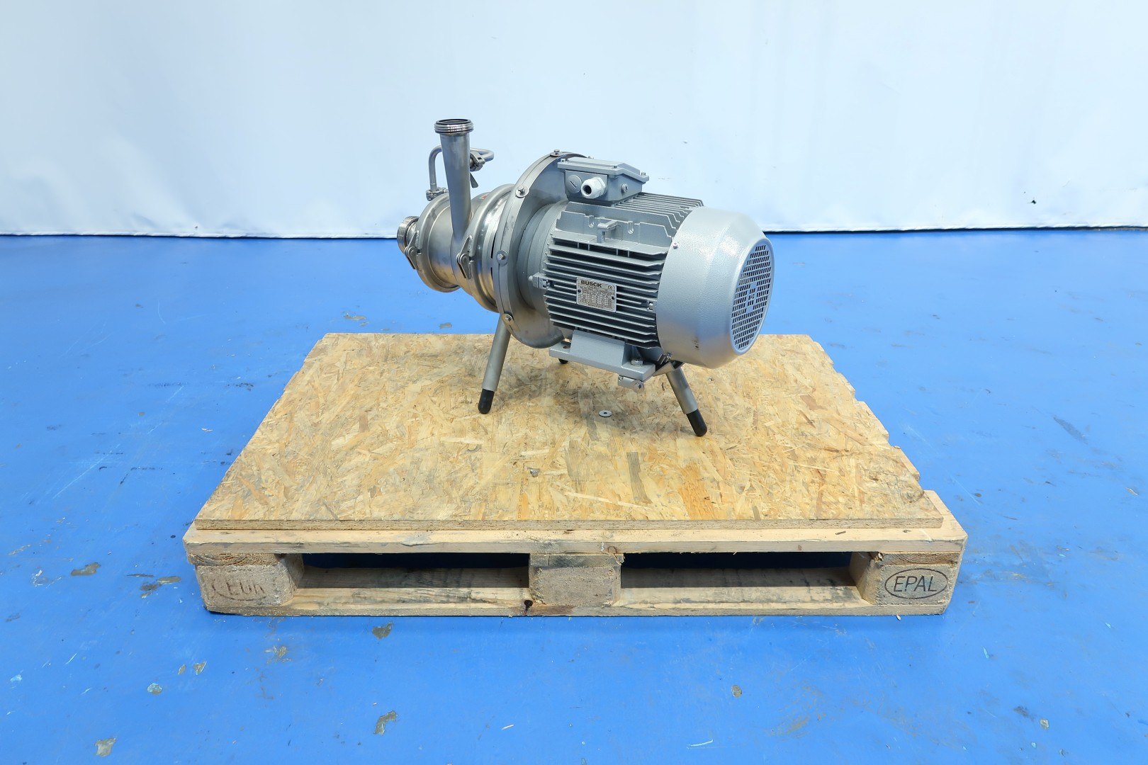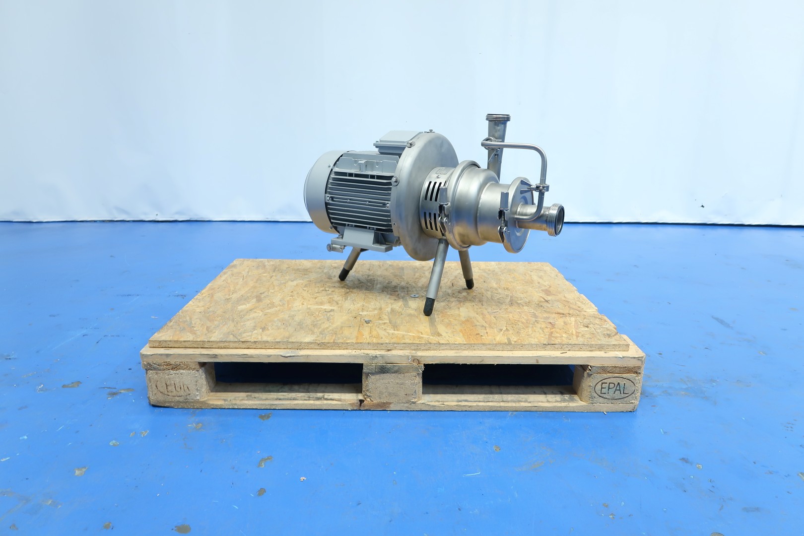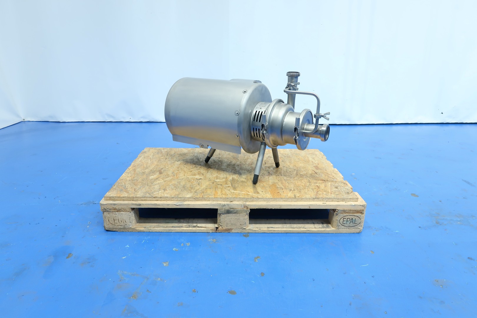 Self priming pump - unique design. Already reconditioned. Ideal for CIP return. Impellor diameter: 125 and 175 mm. Motor: 5,5 kW - 10 A - 2.930 rpm - 50 Hz. Connections: (In) 2,5" SMS / (Out) 2" SMS. Max discharge pressure: 8 bar. Max operating temperature: 95°C. Dimensions: 85x36x53 (lxwxh) - weight: 97 kg.
