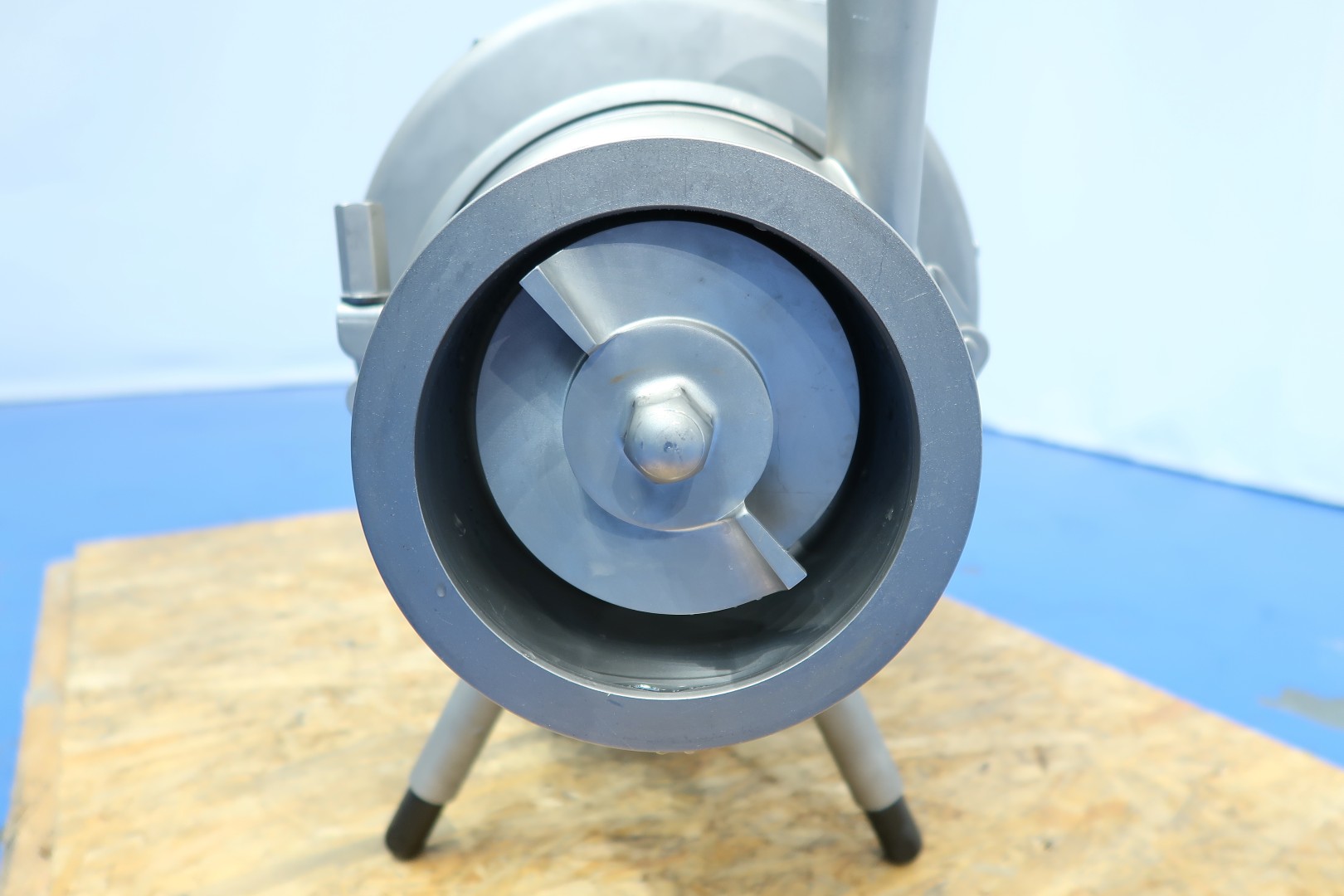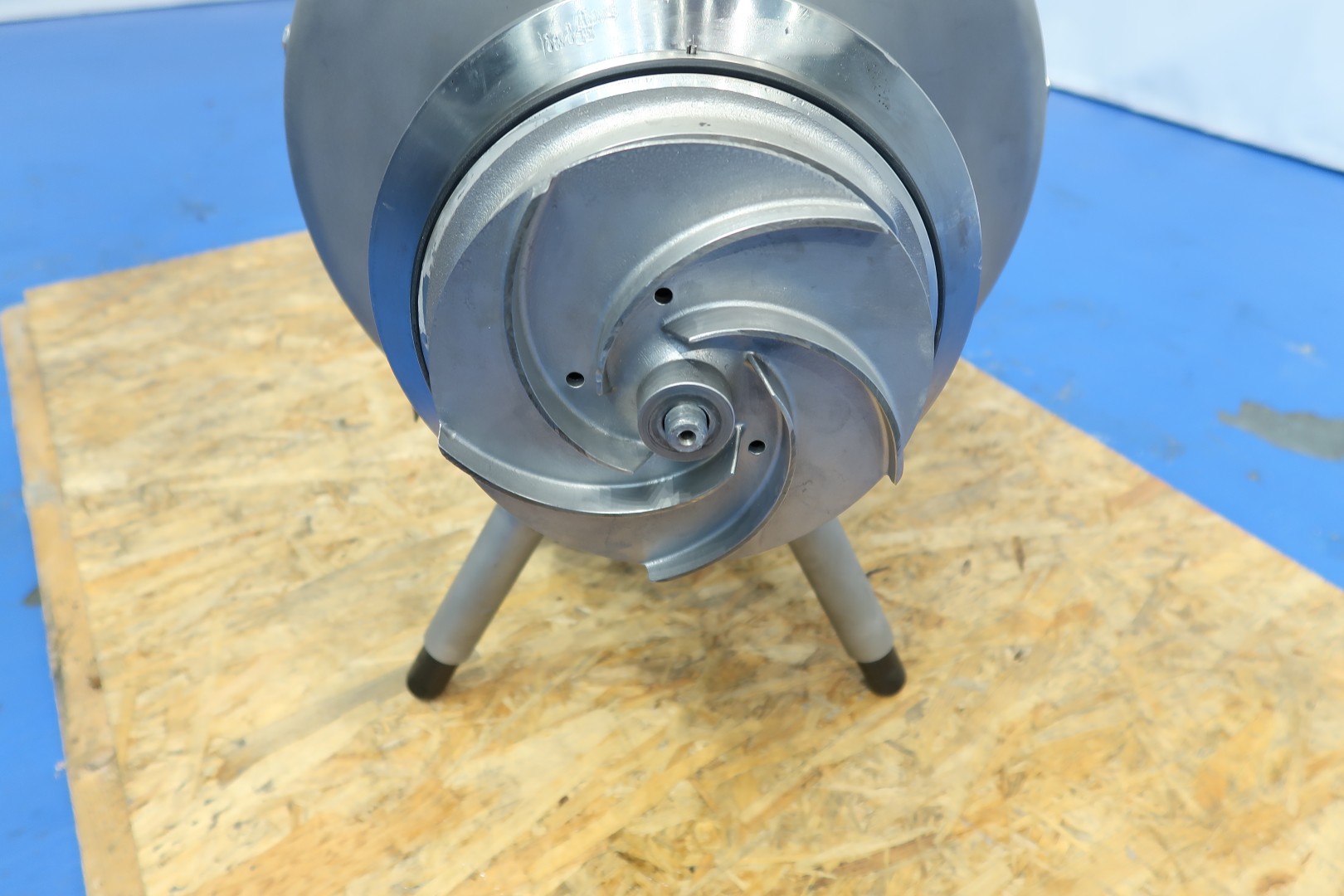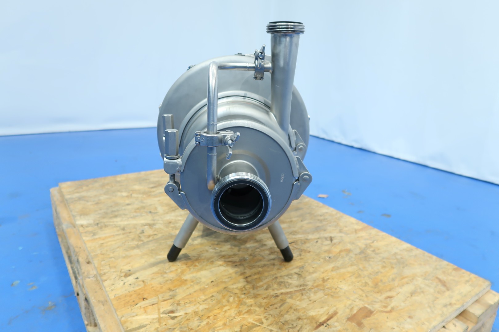 Self priming pump - unique design. Already reconditioned. Ideal for CIP return. Impellor diameter: 125 and 175 mm. Motor: 5,5 kW - 10 A - 2.930 rpm - 50 Hz. Connections: (In) 2,5" SMS / (Out) 2" SMS. Max discharge pressure: 8 bar. Max operating temperature: 95°C. Dimensions: 85x36x53 (lxwxh) - weight: 97 kg.