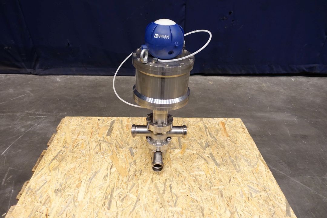 Single Bardiani valve with 4 outputs, single seat. Pneumatic activated 4 way. Connections 4 x 2" SMS. Max pressure 15bar. Kit Code: TTCBKA050M. Dimensions: 30 x 27 x 70 cm. Weigth ca. 30 kg.