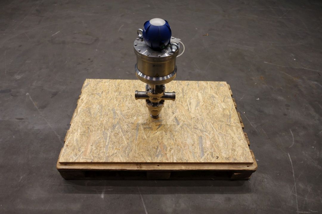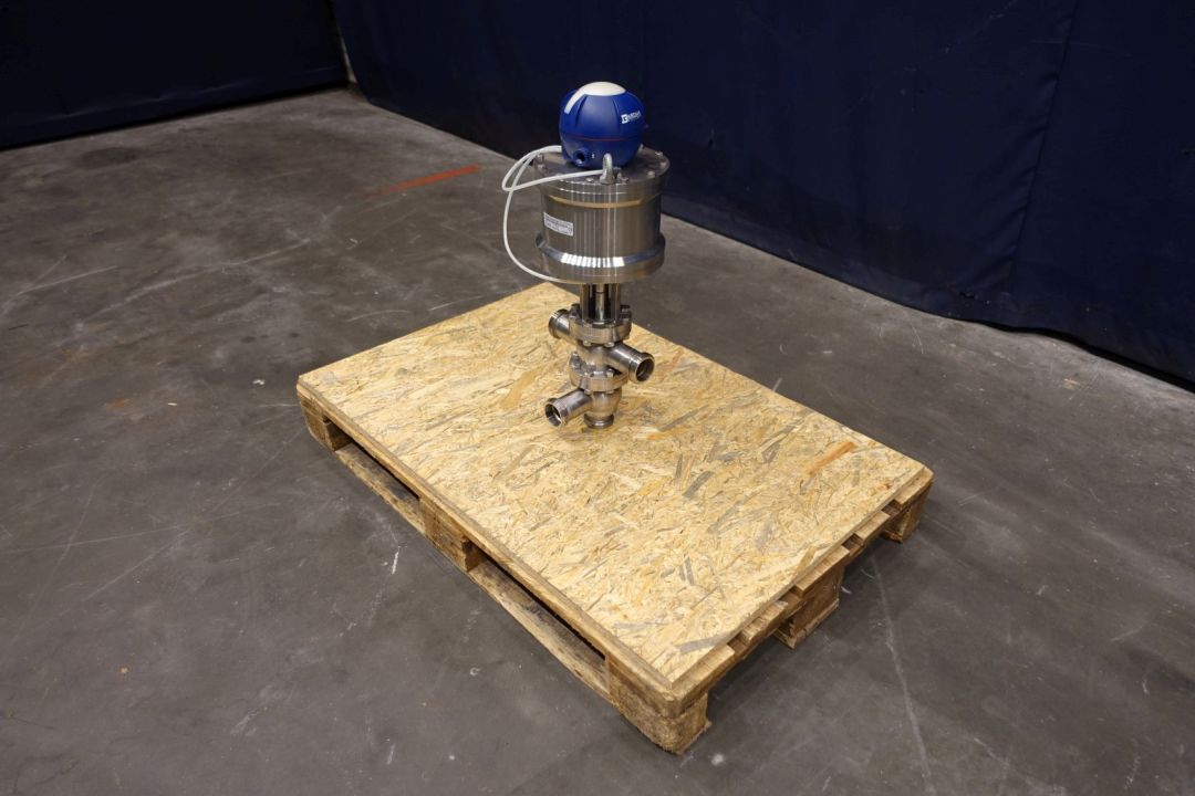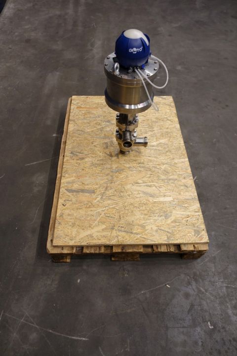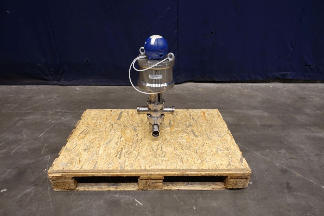 Single Bardiani valve with 4 outputs, single seat. Pneumatic activated. Connections 4 x 2" SMS. Max pressure 15bar. Kit Code: TTCBKA050M. Dimensions: 30 x 27 x 70 cm. Weigth ca. 30 kg.