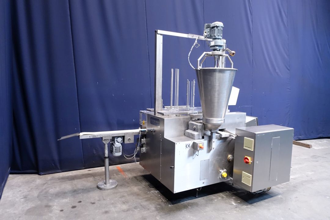 Rotatry filler, with 1 Head, 2 formats: cup size oval: 140x80 mm - cup size square: 130x95 mm. Stations: Cup destacking, double detection, Maindoser (200-250 gram) piston diameter 100 mm, Pistondoser for smooth products. with hopper, agitator (manual cleanable) - no stirrer shaft, interleave paper dispending by vacuum, push station (interleave paper direct on product) snap-on lid, outfeed on +/- 1,8 meter (width 13 cm) single lane outfeed conveyor. used on Herbbutter. Machine has plexiglas safety guards and has a manual central greasing system. 6204 production hours only. Controls: Siemens Logo! cpu and manual buttons. Electric scheme available. Total dimensions 335x170x250 cm.