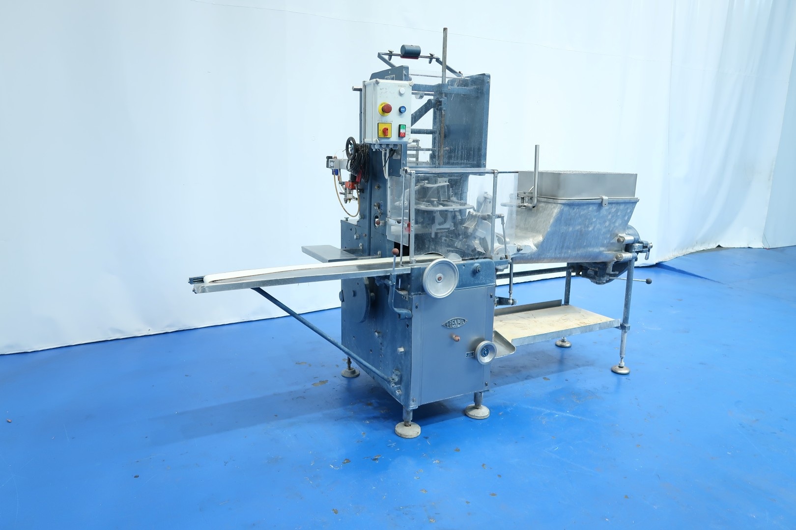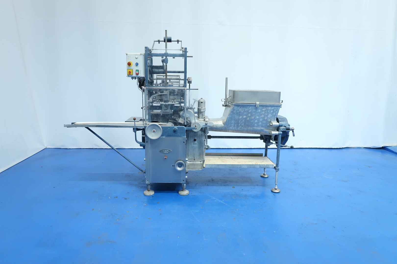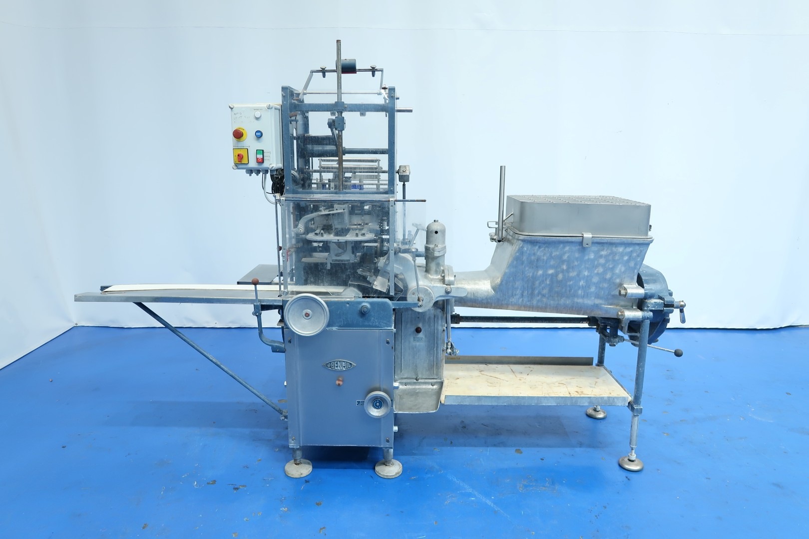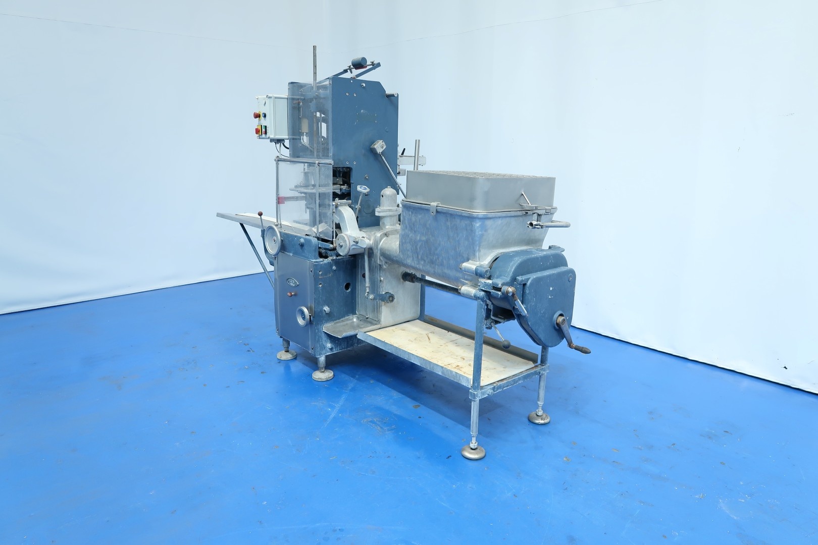 Full Automatic filling and wrapping machine for butter in aluminum foil or parchment paper. Product feed by trough and augers. Date coder by hot foil: Elmoprint M80V. Photo cell for print centring device (paper correction by spot mark). Outfeed conveyor of 130 cm lang and width 10 cm. Format on this machine: 227/250 gram, 95x63,5x40/44 mm. Manual button operation controls directly on machine. Main motor: 1,5 kW - 3,4 A - 50 Hz - 1.410 rpm. Dimensions: 285x100x210 (lxwxh) cm - weight: 1.032 kg.