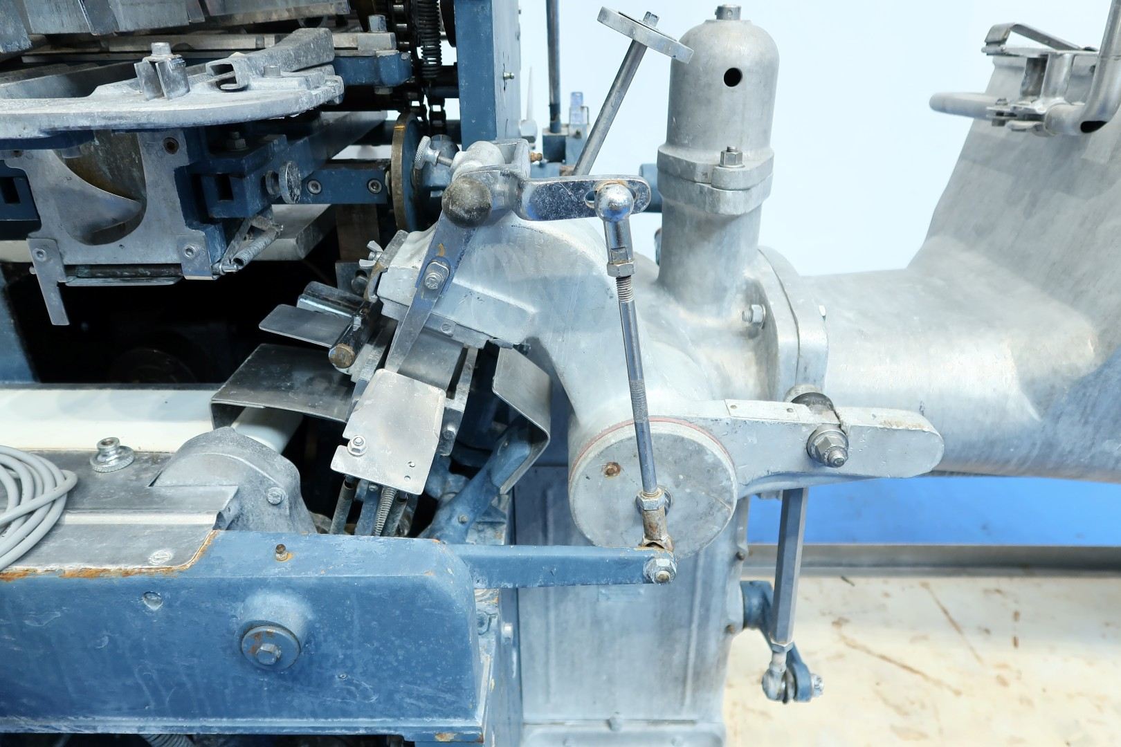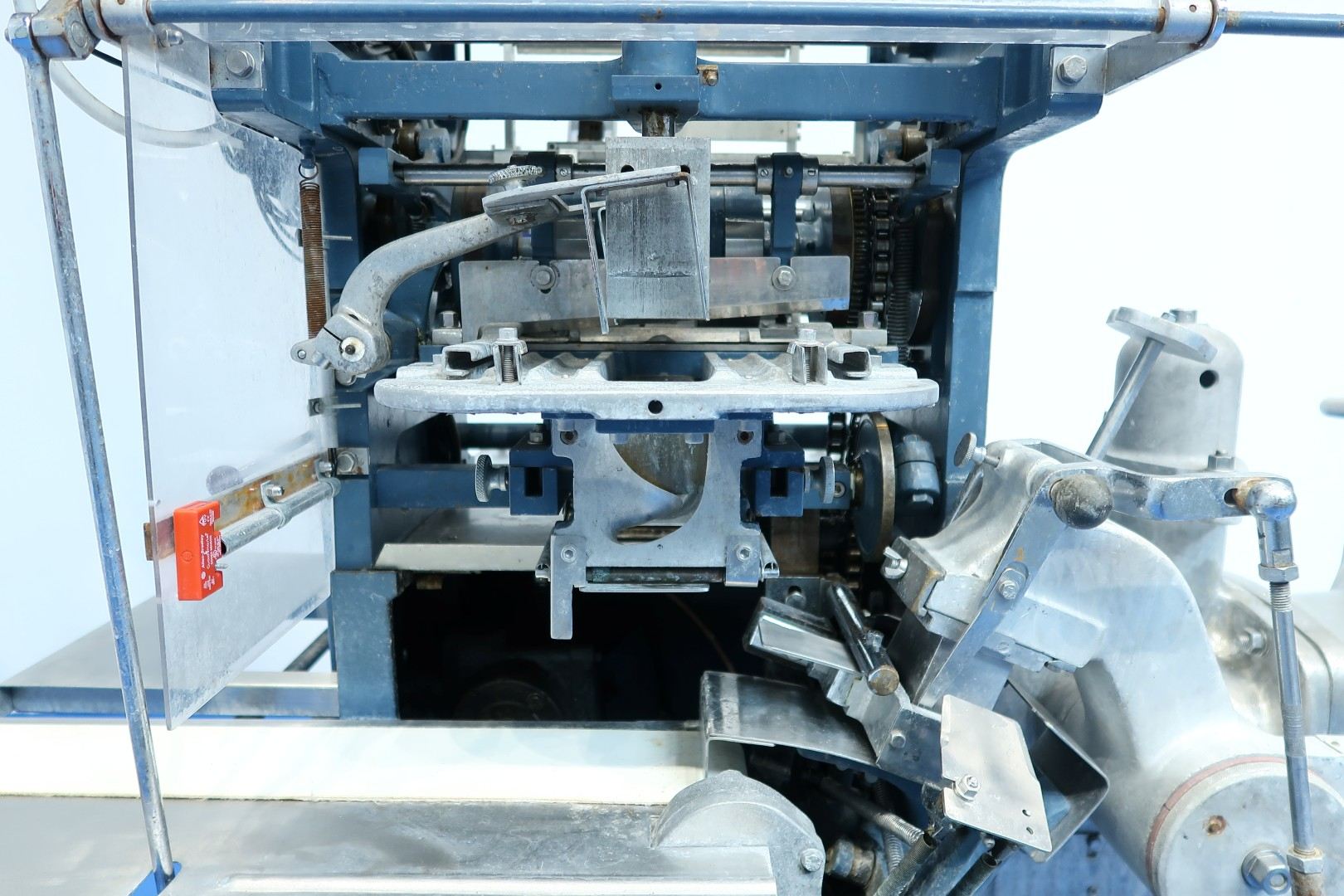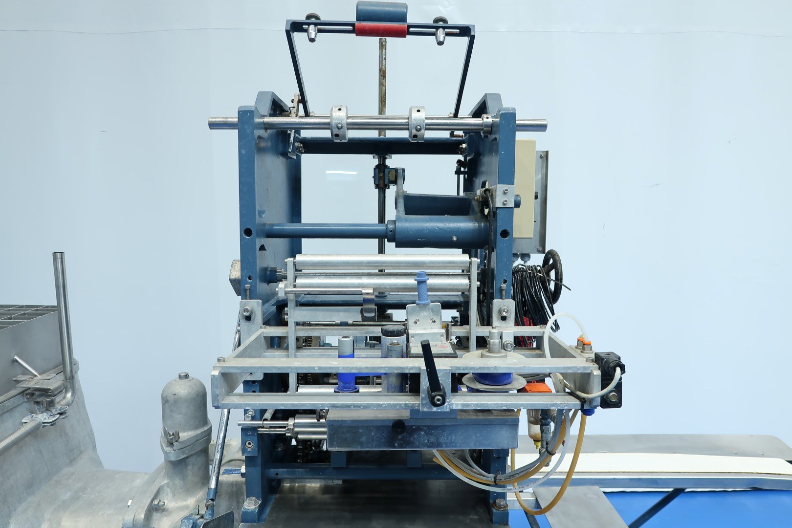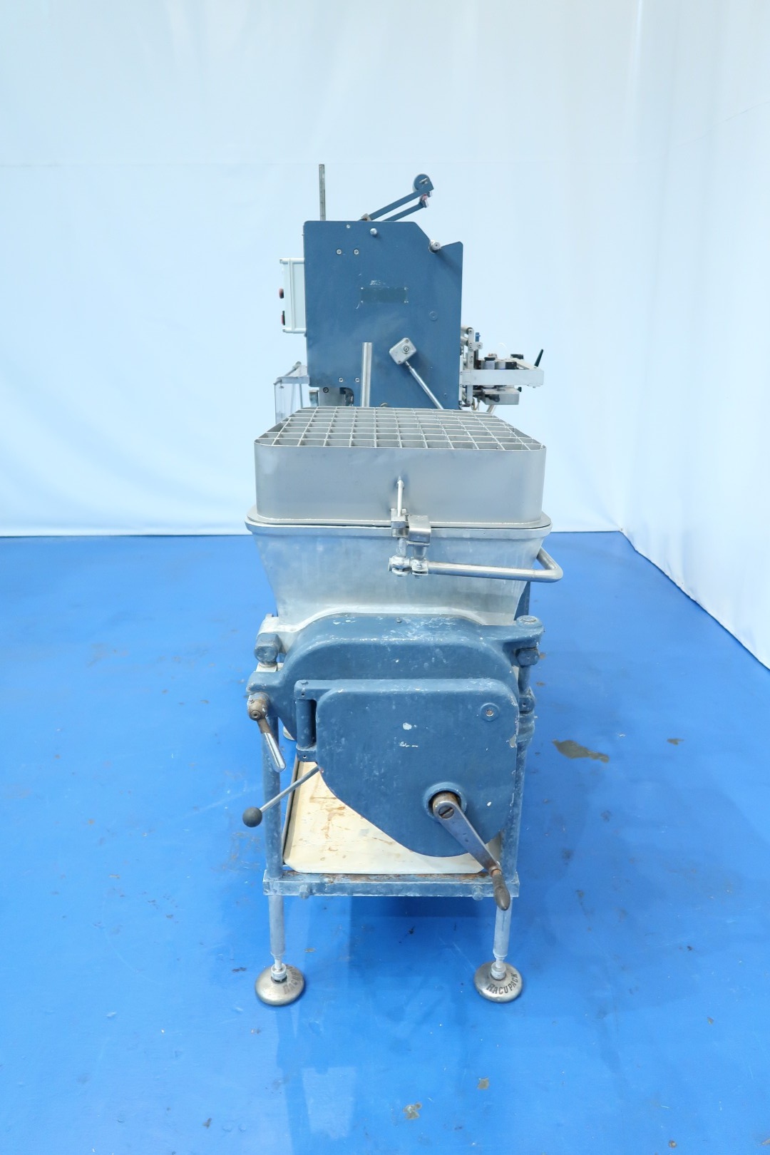 Full Automatic filling and wrapping machine for butter in aluminum foil or parchment paper. Product feed by trough and augers. Date coder by hot foil: Elmoprint M80V. Photo cell for print centring device (paper correction by spot mark). Outfeed conveyor of 130 cm lang and width 10 cm. Format on this machine: 227/250 gram, 95x63,5x40/44 mm. Manual button operation controls directly on machine. Main motor: 1,5 kW - 3,4 A - 50 Hz - 1.410 rpm. Dimensions: 285x100x210 (lxwxh) cm - weight: 1.032 kg.