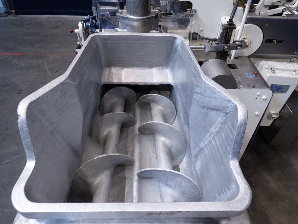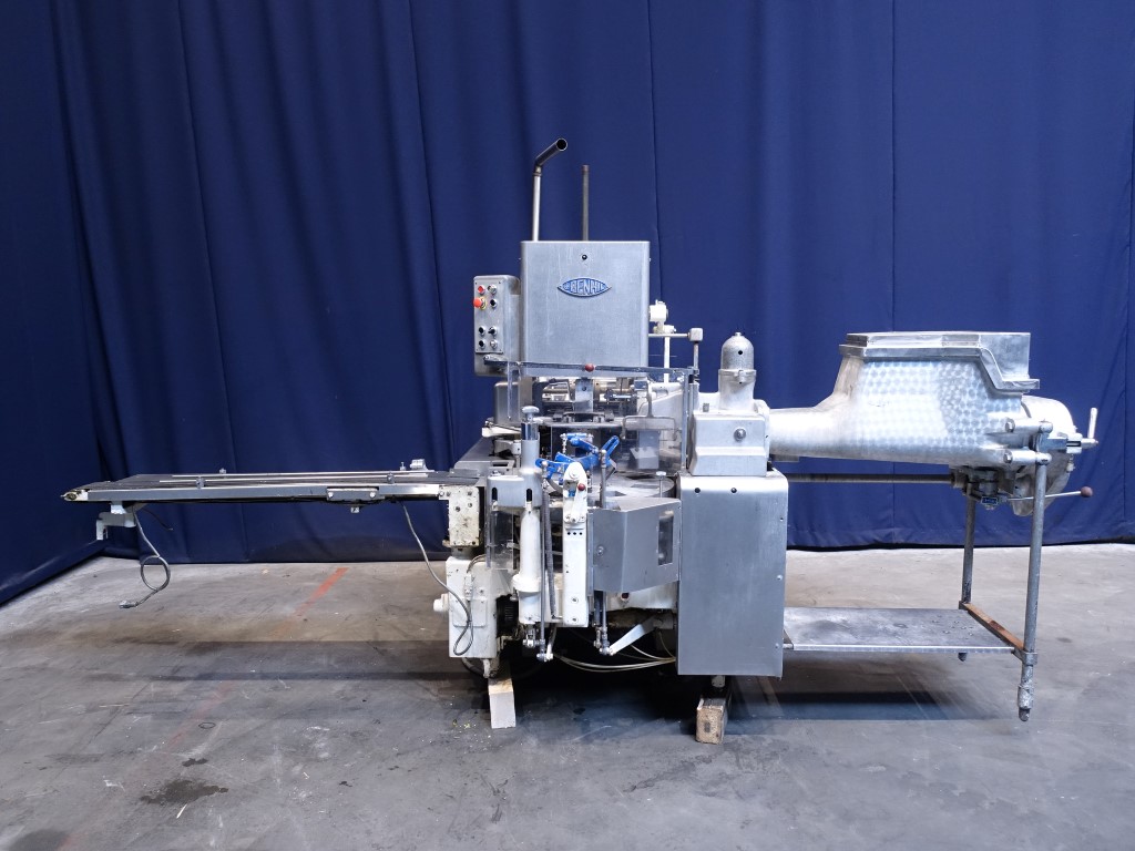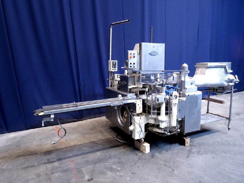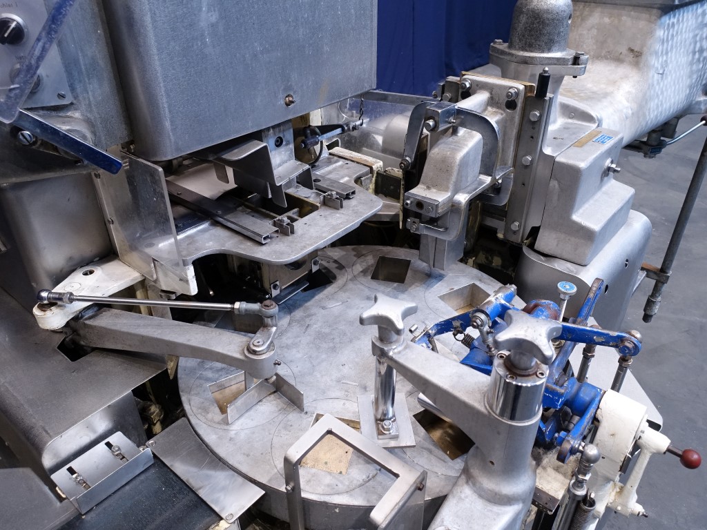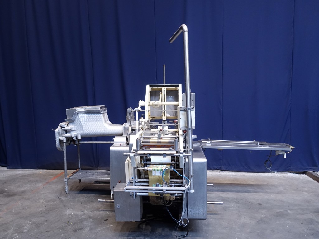 Full automatic filling and wrapping machine for butter in aluminum foil or parchment paper. Product feed by aluminium trough and augers Date coder by embossing ink (Elmoprint). Print centring by finger (no photocell). Outfeed conveyor of 160 cm. Current format set: 250 gram, 100 x 75 x 35 mm. Control panel with relay control. Total dimensions: 4 x 2,4 x 2,5 mtr.