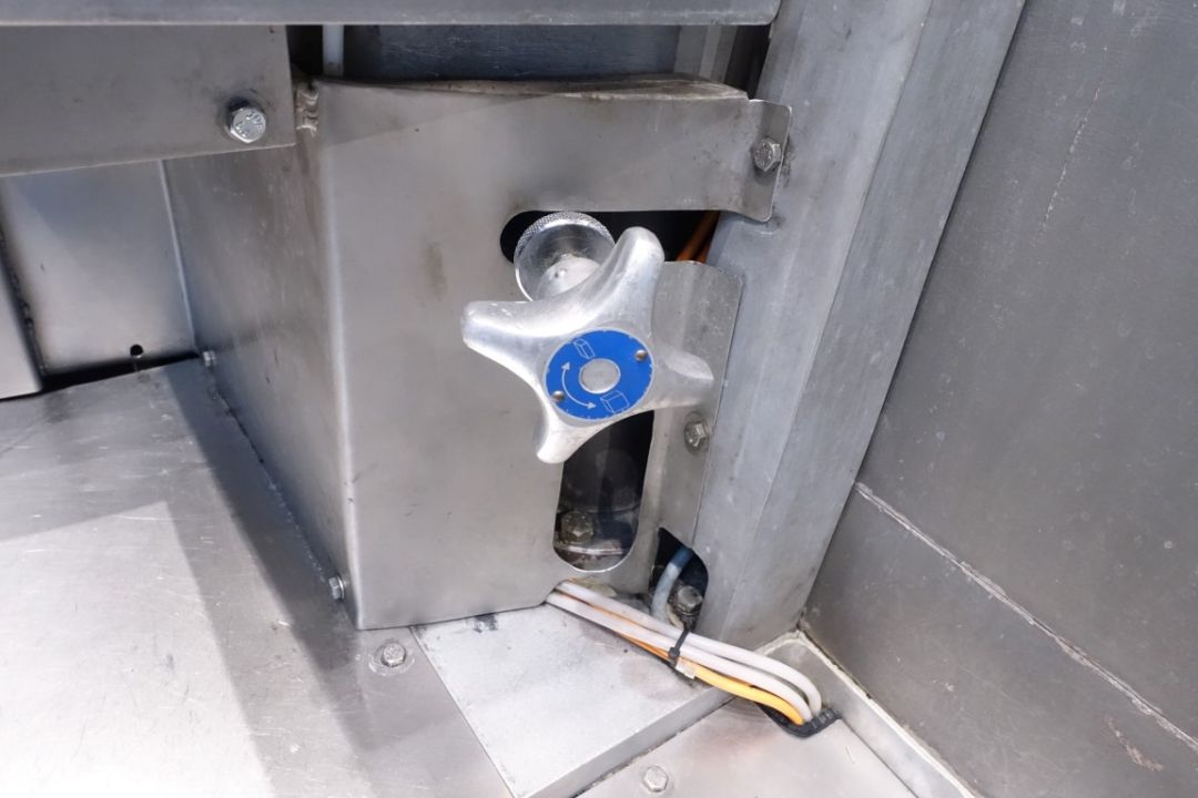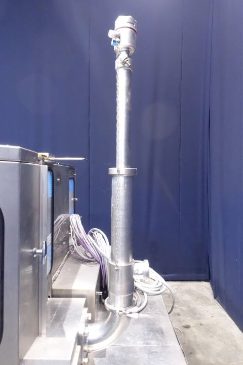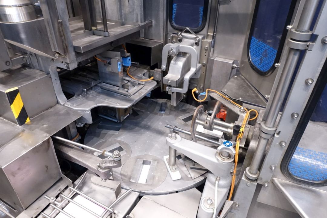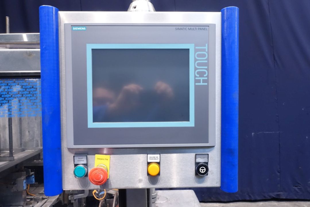Full automatic filling and wrapping machine for butter in aluminum foil or parchment paper. Machine covered with stainless steel doors with polycarbonate windows. Product feed by direct link up with compensator with liniair meter on compensator giving signal to control feed pump. Photo cell for print centring device (paper correction by spot mark). Outfeed conveyor of 80 cm. Format set on this machine: stick, ± 125 gram, ± 120 x 35 x 30 mm. Free standing stainless steel control panel with PLC control (Siemens S7-300) and frequency converter. Siemens touch screen operation panel. Reconditioned by Schuy in 2005. CE tag on the machine. Total dimensions: 240 x 210 x 240 cm and 130 x 50 x 230 cm.