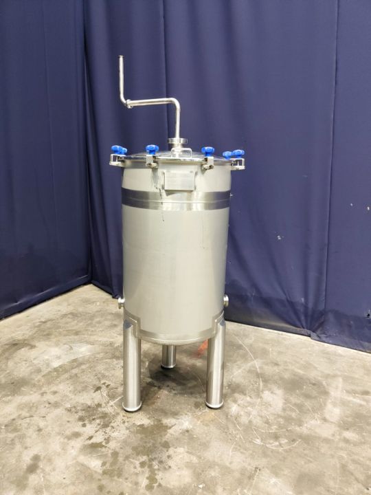 Balance tank. Open top with cover. Pressure in tank atmospheric. Overflow pipe. 3 legs. Total dimensions: 105 x 90 x 210 cm.