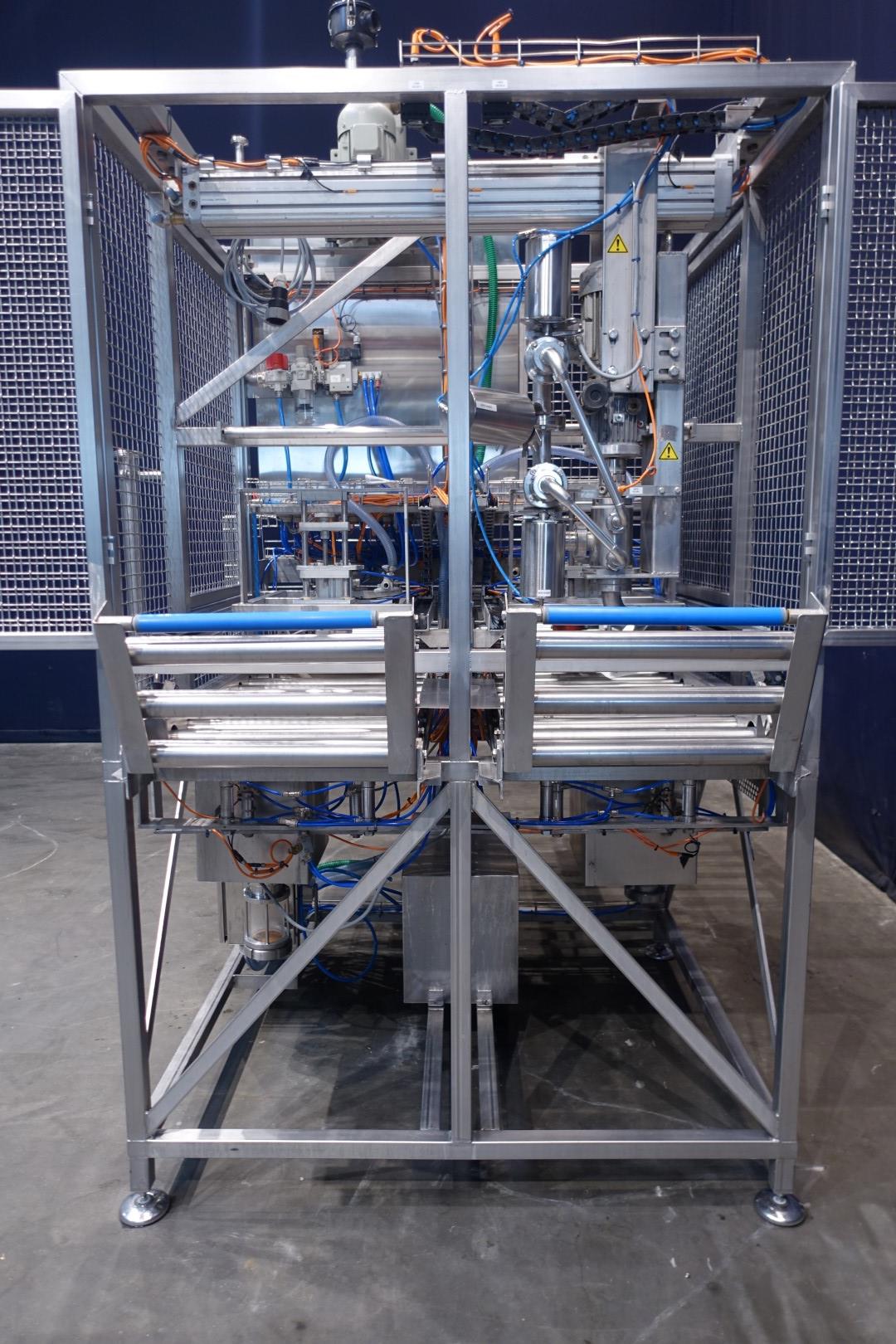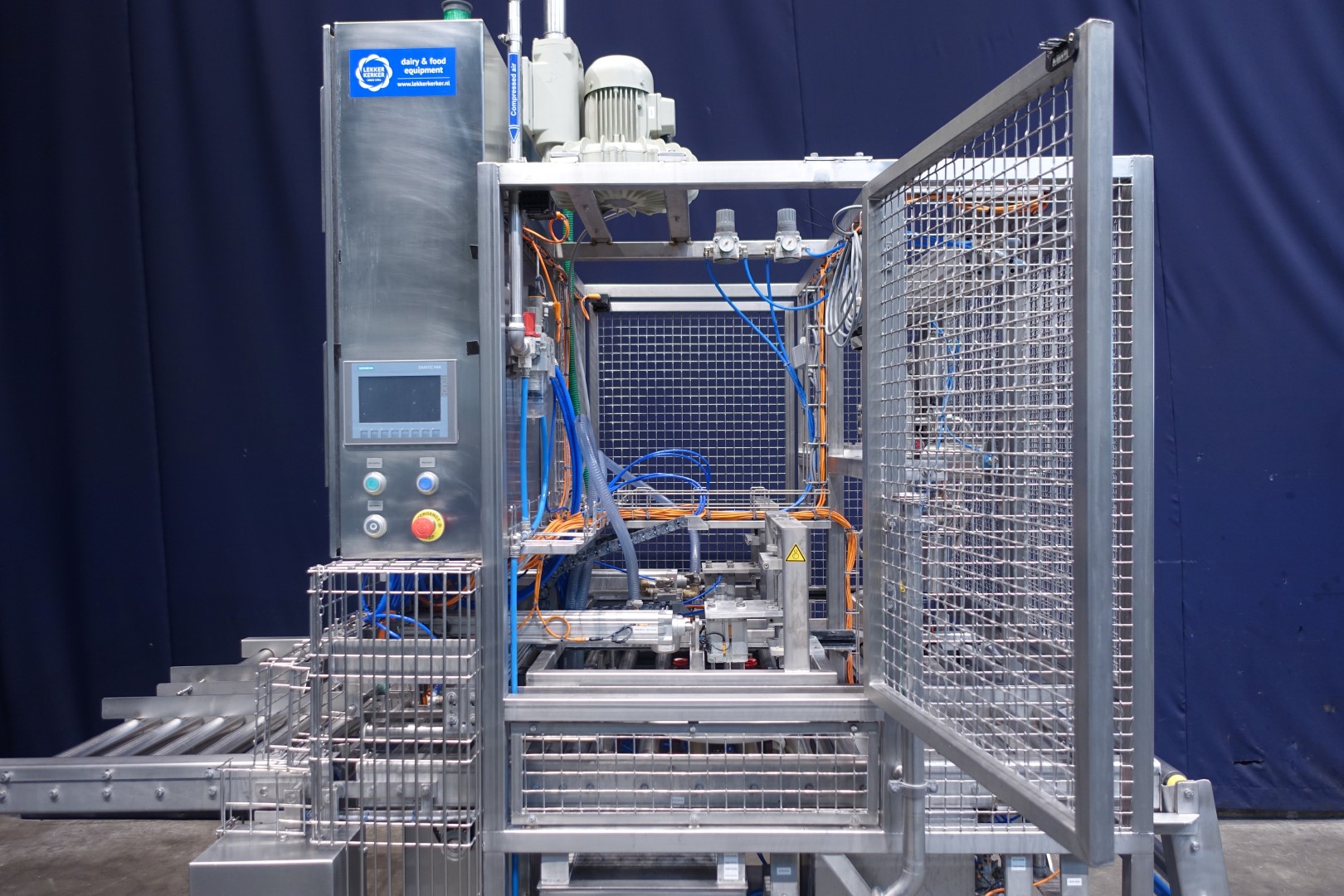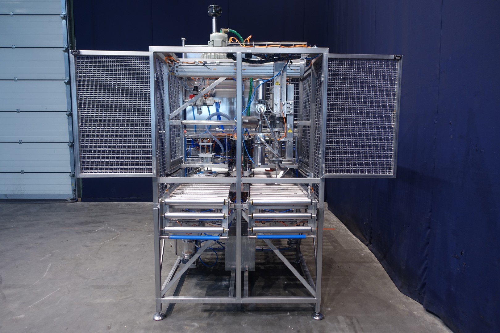 Soft cheese cutting and stuffing machine. 140 Pieces Brie per hour per belt, in total 300 pieces with 2 belts. Power: 5,1 kW - 15,7 A - 50 Hz - compressed air 25 L/min - 6 bar. Total dimensions: 262 x 155 x 282 cm. Weigth 870 kg's. Unique design machine for making stuffed cheese from a standard semi soft cheese like Brie, Camembert or Columbier etc. A round cheese with a diameter of around 330 mm and with a weight of around 3-5 kg are cut, stuffed with a pumpable cream cheese. Working principle: inlet by a roller conveyor, then cut the cheese in half horizontally. Pick-up the top of part of the cheese and lift it. Then the underside of the brie is stuffed with a layer of a viscose product like a pumpable cream cheese or processed cheese. The last step is to place the upperpart of the cheese back on top. Ideal for ‘bites’ like products with different cheeses mixed. Stand-alone unit. Including SS safety fences, CE marked. Including Siemens S7 and HMI control panel. A video of the machine in production can be send on request.