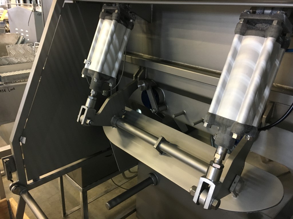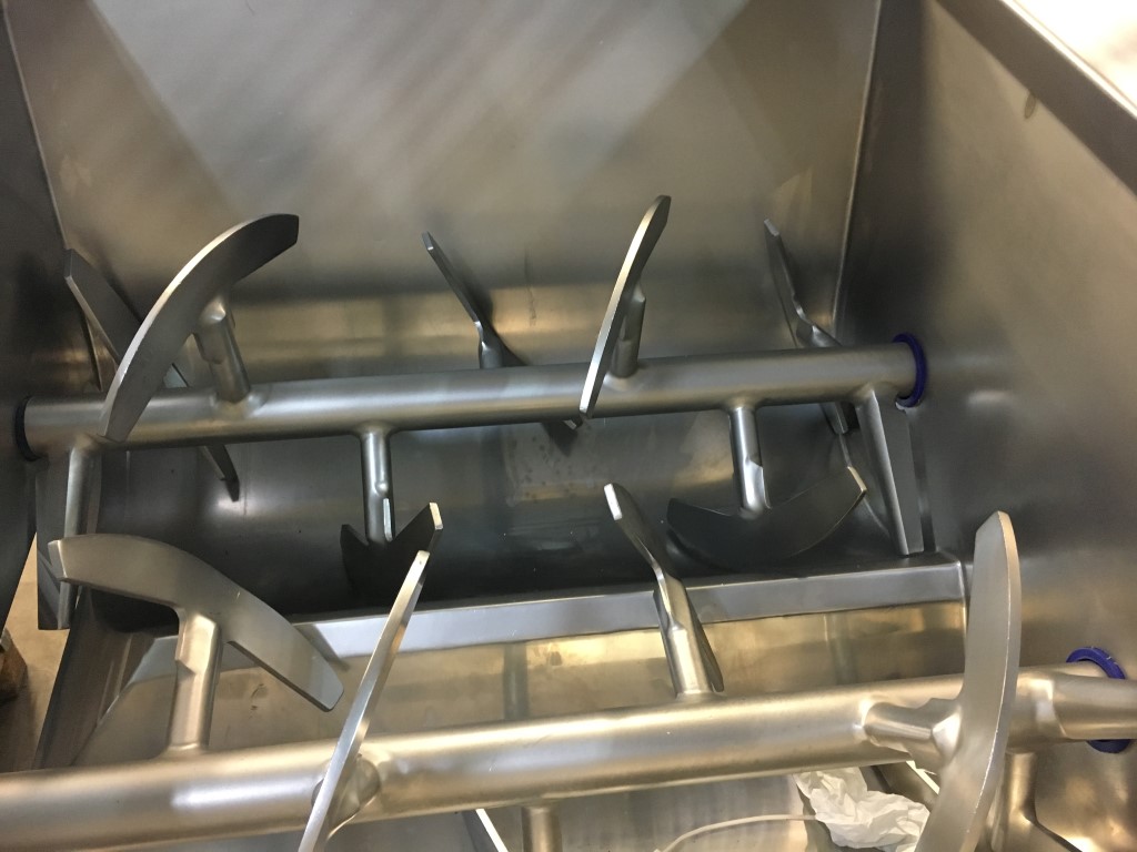 Peddle mixer with 2 axles. Horizontal. Single jacketed. Manual cleanable. Outlet slide, pneumatic controlled. Framework cover. Cover manual tiltable. 2x independent motors: 7,5 kW - 400 V - 15,5 A - 50 Hz - 965/1450 rpm. Reduction box: i = 40. N2: 24/36 rpm. Dimensions product room: 80 x 90 x 60 cm. Control panel with PLC and Allen-Bradley PanelView 550 operation panel. Total outside dimensions 190 x 180 x 160 cm.