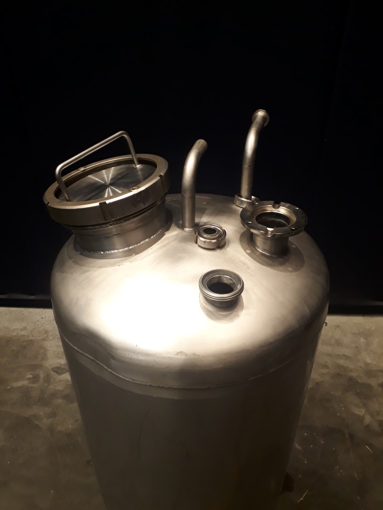Closed vertical level tank. Pressure in tank atmospherique. Conical bottom. Product outlet 2'' DIN, outlet height: 25 cm. Connections for: PT-100 temp sensor and low level sensor. 1 CIP spray bowl. Manhole in top, round diameter 200 mm. 3 adjustable feet. Inside dimensions Ø 580 mm and height 850 mm. Total dimensions: Ø 80 x 155 cm.