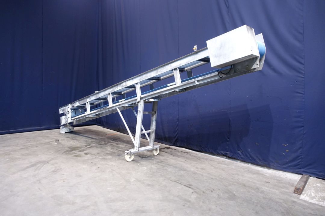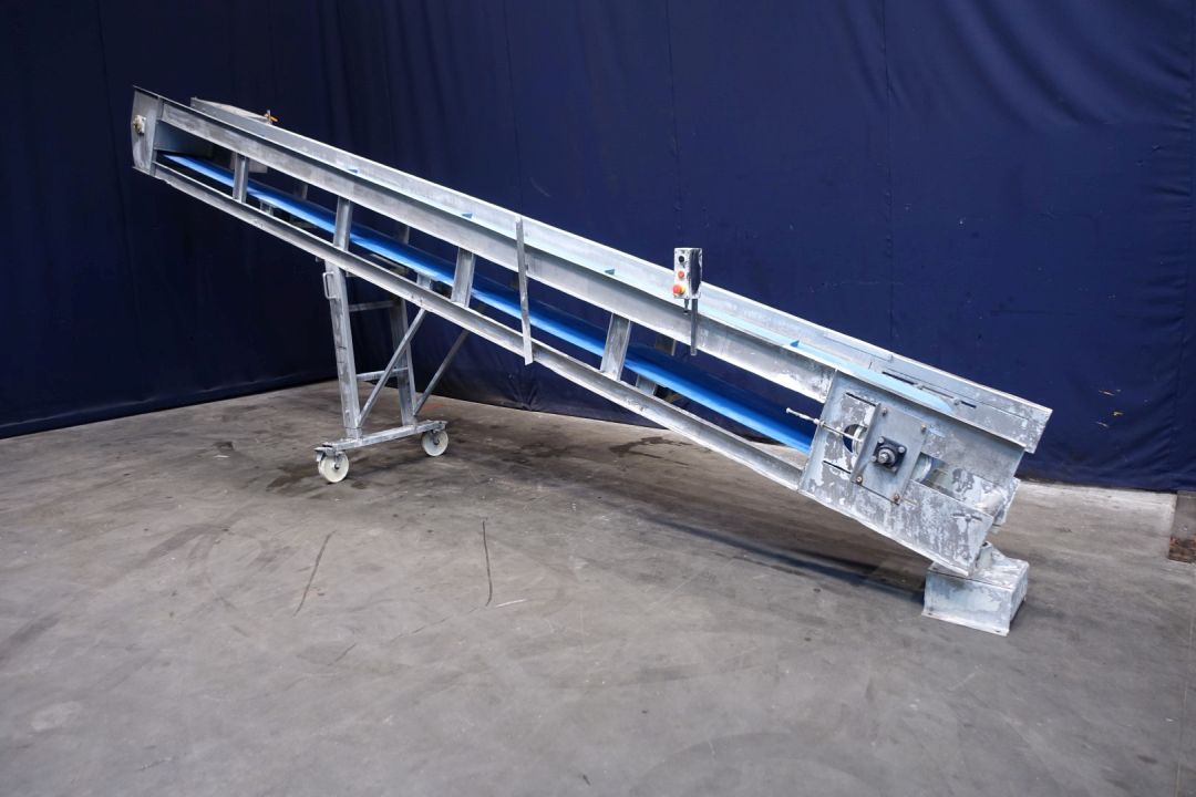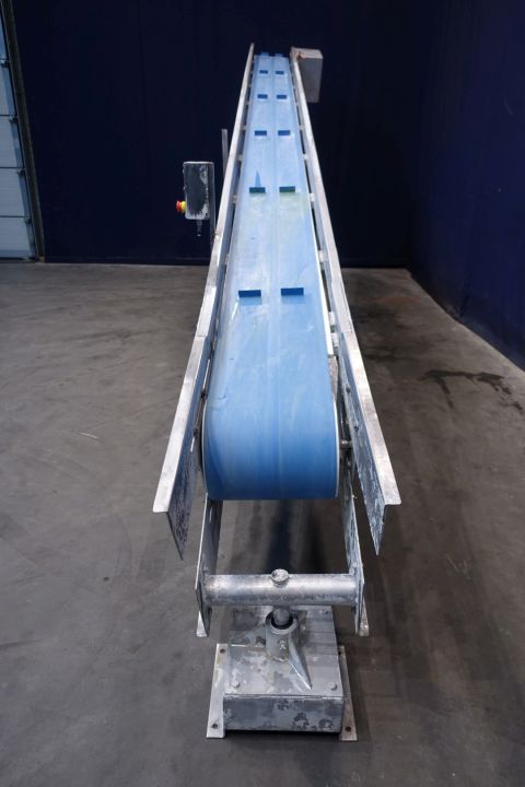 Ascending beltconbeyor for butterblocks, 25kg. SS frame, movable to side. Ca. 30 degree angle up. Effective Belt L 592 x 35 cm. Distance between drivers 101,5 cm. Electric drive Motor. Total Dimensions: 622 x 95 x 252 cm. This butterblock transportconveyor has functioned with A Simon Freres Contimalax cm 300 reworker. Which has stocknumber 15329, and will only be sold togetgher.
