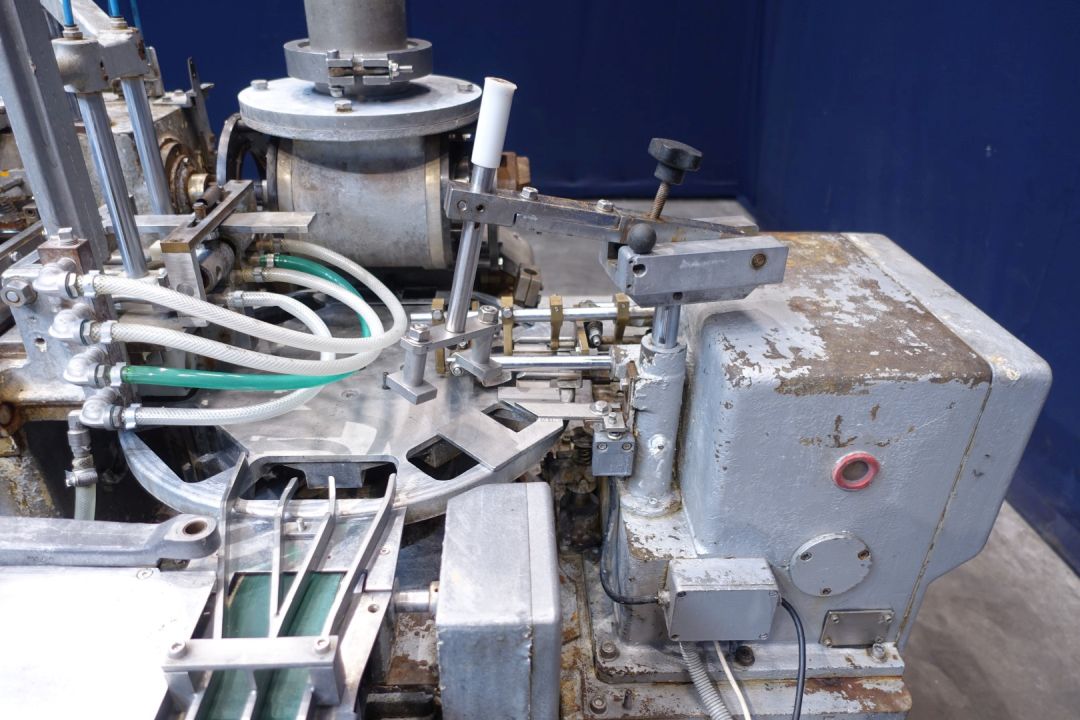 Incomplete 2 head rotary mini butter portion packer for rectangular hotel portions, packaging format 10 gram: 41,5 x 25,5 x 10 mm. Including integrated packer. Packing scheme of the packer: 10 gram, 125 portions, 1,25 kg per carton, 5 layers high. (5x5x5). Direct connection for butter feeding. No photo cell detection (continuous printed foil used). List with missing parts can be sent on request.
