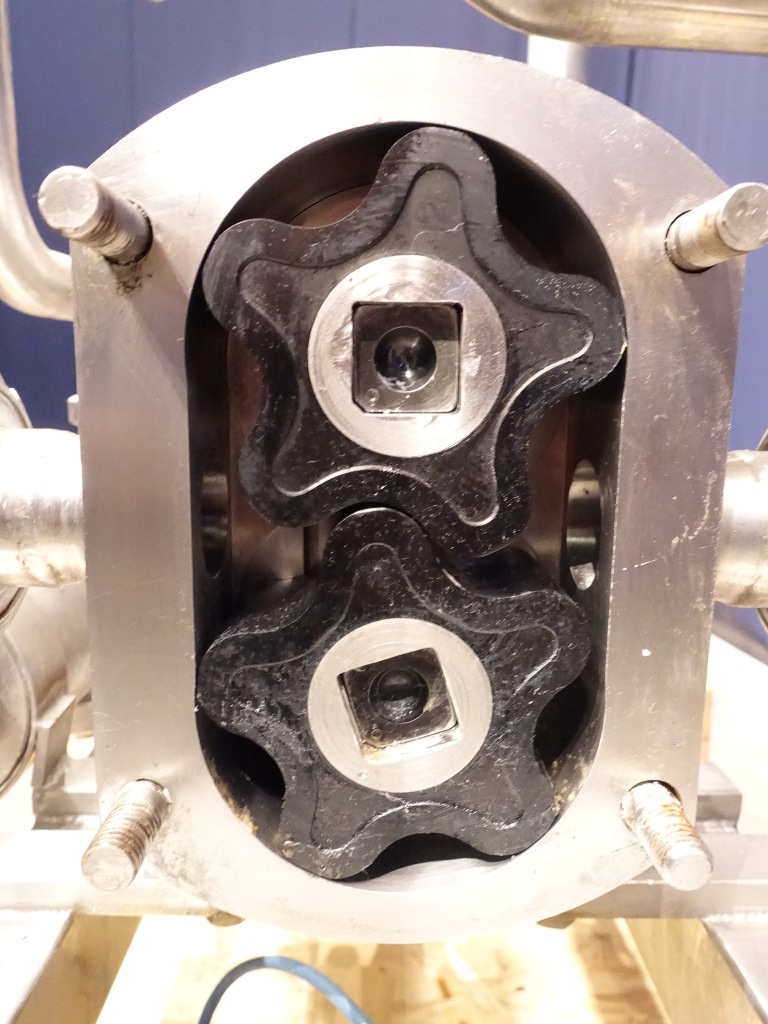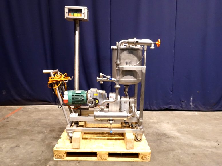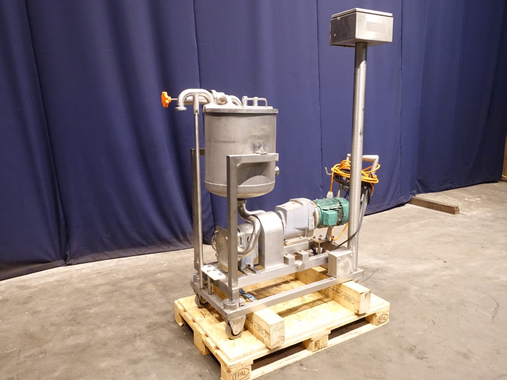 Lobbe pump with tri gummy lobbes. Diameter lobbes: 98 mm. Displacement per revolution: 0,243 ltr. Nominal capacity 8,2 m3/h. Current drive work: motor: 2,2 kW - 5,0 A - n1: 895 rpm - i= 3,5-17,6 - n2: 50 - 255 rpm. Max speed: 600 rpm. Variable speed by mechanical variator. Stainless steel cover over electric motor. Design pressure up to 6 bar. Over pressure valve. Mounted on a mobile frame with hopper (50 L). Connections: DN40, SMS. Total dimensions: 70 x 150 x 180 cm.