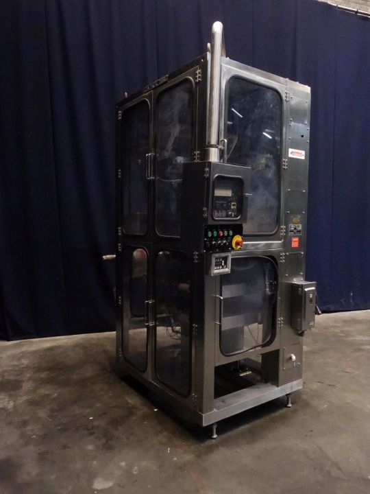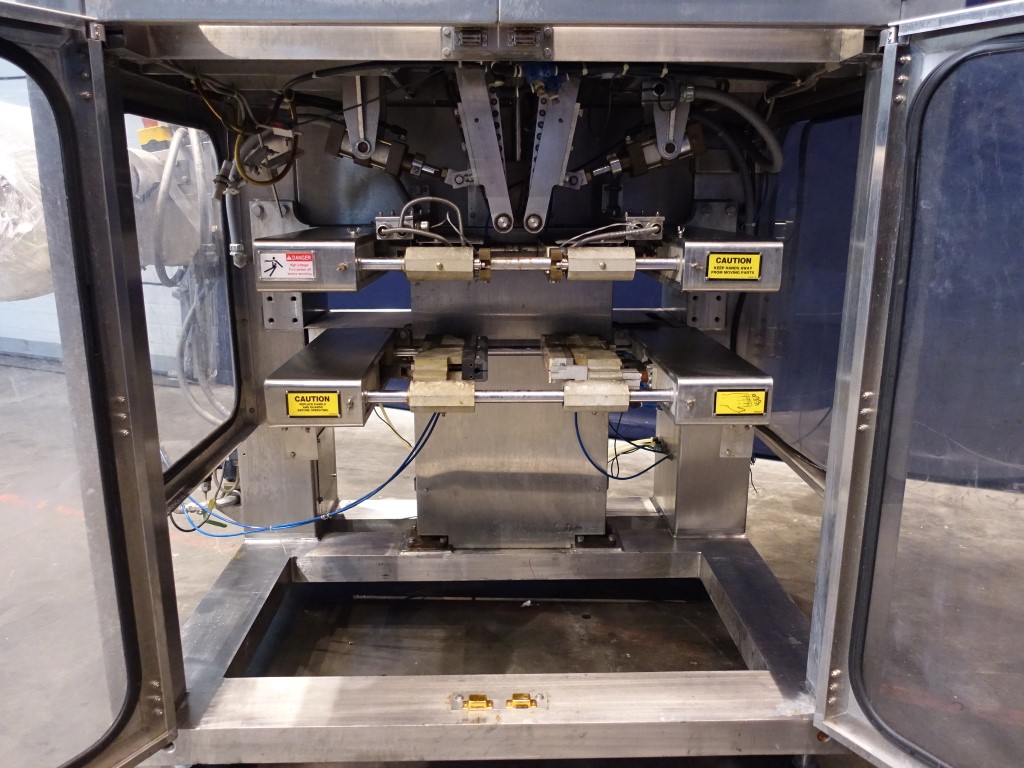 Vertical Form, fill, seal, machine, for big pouches/bags for hot fill, model number RC2000B, DIAG number PEHOE026, serial number 0067, 3 phase, 230 volt, 60 Hz, air 30 CFM, 90 PSI, 5000 Amps, all stainless steel construction, 2 1/2 " diameter tube for 4" (101 mm round) wide pouch, 1" product inlet, roll stack feed, dual sealing jaws, with controls. Total dimensions: 140 x 230 x 290 cm. This unit has the unique feature that it seals through the product so no air inside of the pouch.