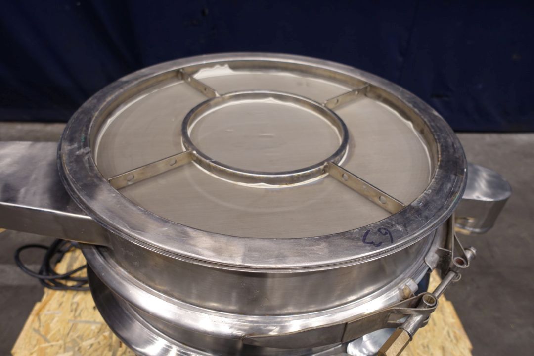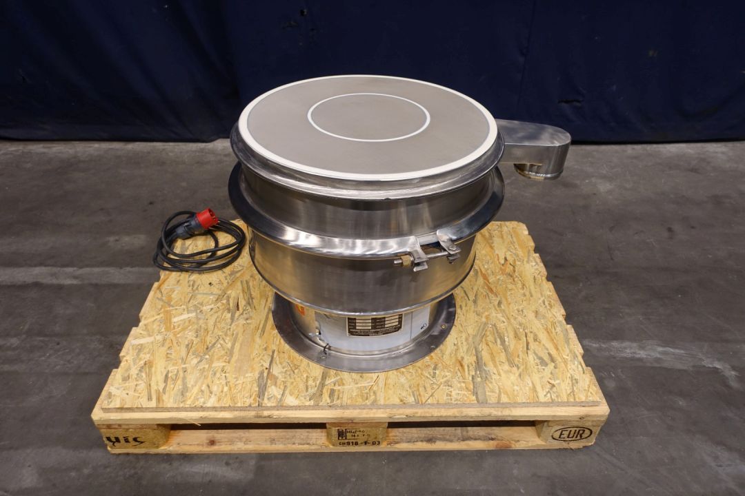 Rotary Vibration Screen-machine. For sieving particles. Incl. 2 x 30 inch food safe sieve windows. 1 x Mesh size: 42 micron - wire thickness: 36 micron (material: AISI 304). 1 x Mesh size : 63 micron - wire thickness : 40 micron (material: AISI 304). Vibrating force: 5 Kn - amplitude: 3-5 mm. Power: 380 V - 0,55 kW - 50 Hz. Connections: 2 x 120 mm - 1 x 130 mm - 1 x 11,5 mm. Total dimensions 120x80x70 cm. Weigth 126 kg. Capacity estimate up to 10,000ltr/h depend on product