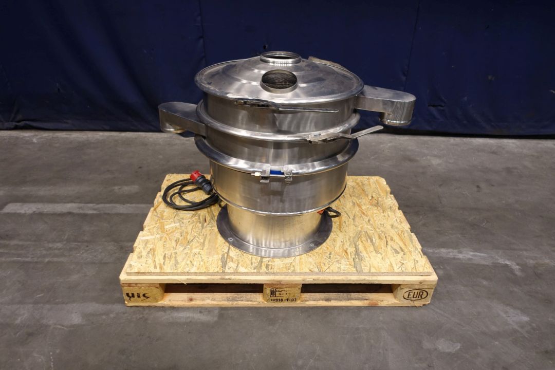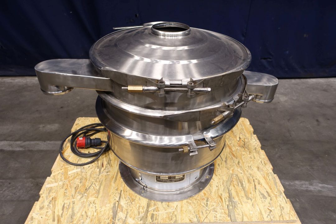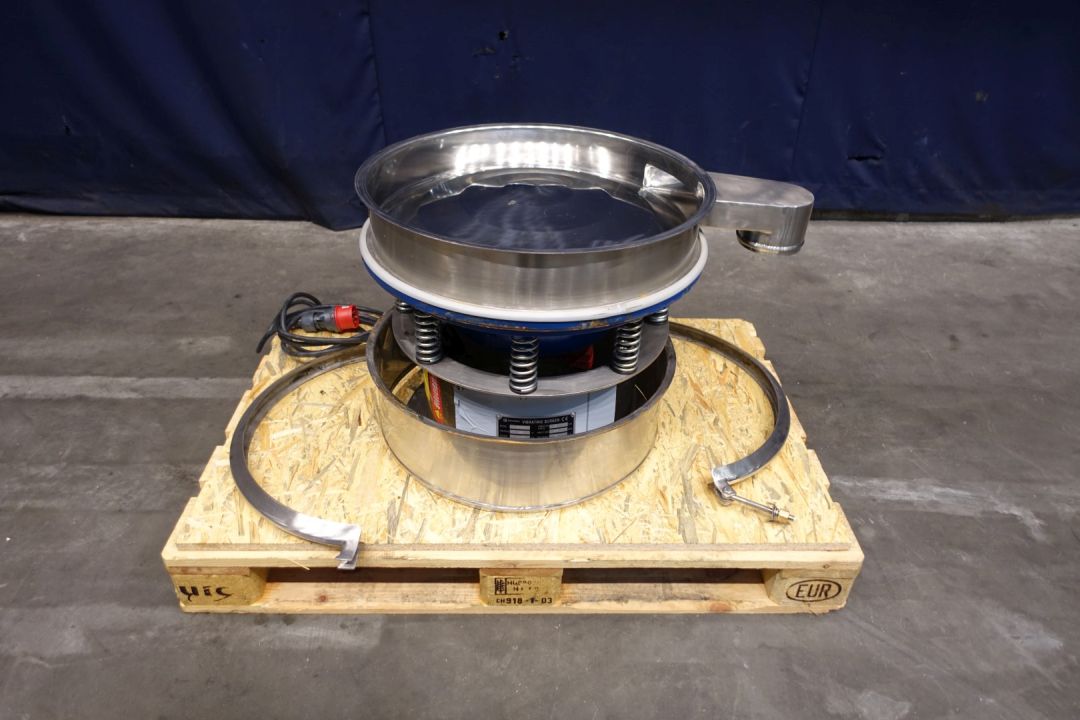 Rotary Vibration Screen-machine. For sieving particles. Incl. 2 x 30 inch food safe sieve windows. 1 x Mesh size: 42 micron - wire thickness: 36 micron (material: AISI 304). 1 x Mesh size : 63 micron - wire thickness : 40 micron (material: AISI 304). Vibrating force: 5 Kn - amplitude: 3-5 mm. Power: 380 V - 0,55 kW - 50 Hz. Connections: 2 x 120 mm - 1 x 130 mm - 1 x 11,5 mm. Total dimensions 120x80x70 cm. Weigth 126 kg. Capacity estimate up to 10,000ltr/h depend on product