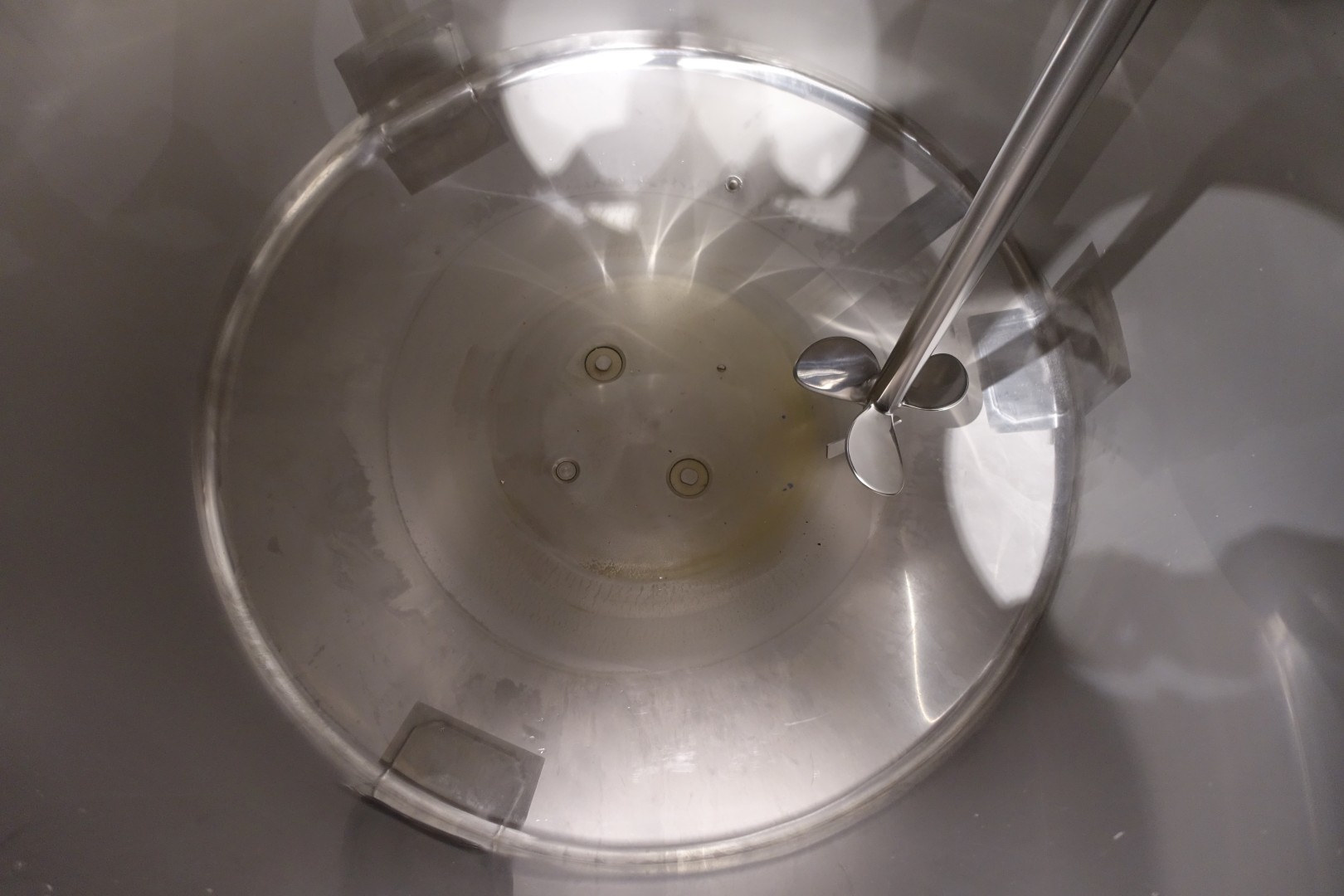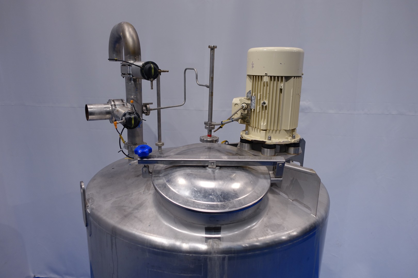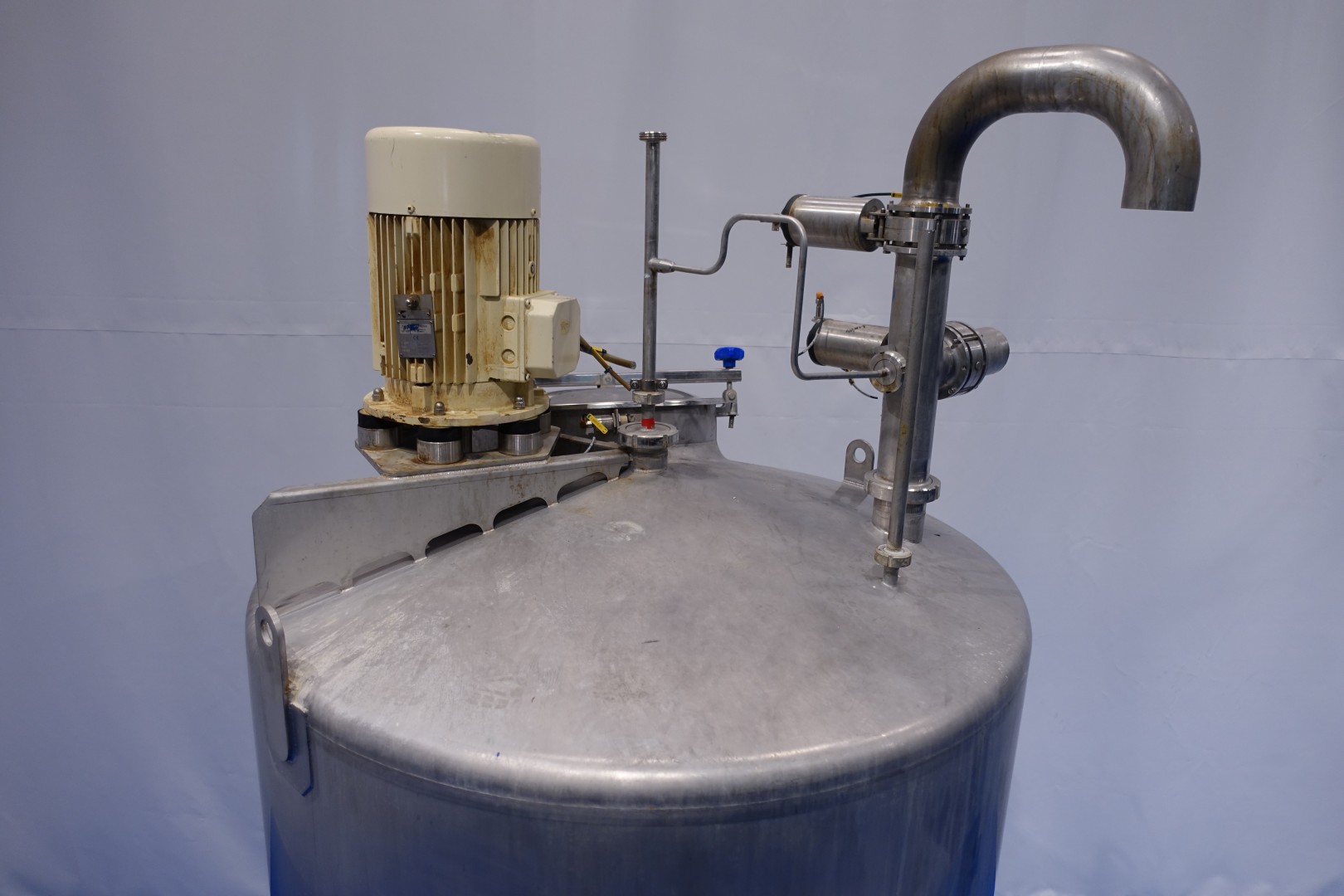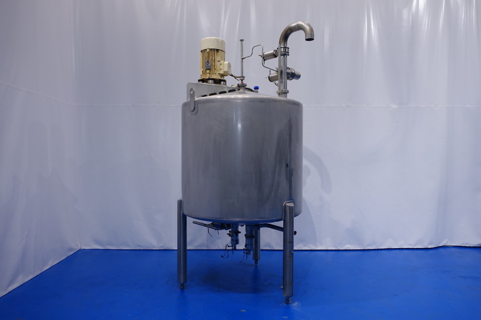 Vertical single jacketed storage tank with agitator. Nominal volume: 2.100 liter. Maximum cleaning temperature: 85°C. Top driven propellor agitator, Jongia type: JDR 7,5/4B - built in 2012 - motor: 5,5 kW - 12,5 A - 710 rpm. With pressure transmitter in bottom. 2 CIP spray bowls of which one in product air-inletpipe. 3 Adjustable feet. Outlet height ca. 71 cm. With 2x Bottom double seat mix proof outlet valves make: hovap with 2 position sensors. Each valve has 2 connections to be able to flush the outlet pipe even when tank is full. Manhole in top round Ø 51 cm. Inside dimensions of tank: Ø 120 cm - cylindrical height: 125 cm. Total dimensions (lxwxh) 150x150x320 cm - weight: 508 kg's.