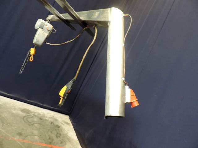 Stainless steel pole with swing arm and Demag hoist. Crane to lift out the bowl of a separator. Complete with baseframe. Lifting weight: 500 kg. Total dimensions: 200 x 160 x 360 cm.