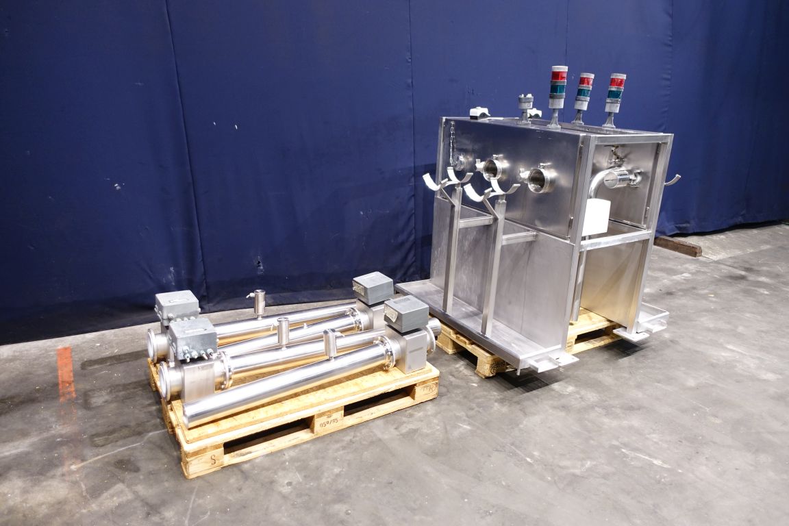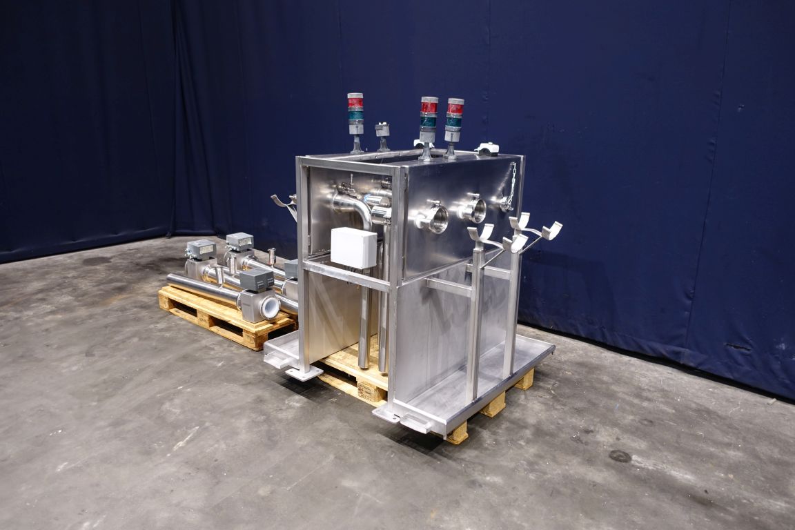4 Reception units for truck unloading by gravity. 4 Flow transmitter Diesel (total count send to scada system), 1 panel for reception units with start/stop button for driver. Emptying of trucks with Raw milk by Free fall to the basement by gravity to lower placed tanks, capacity depending on the connection (outlet size) on the truck. Total dimensions of reception unit: 130 x 160 x 150 cm.